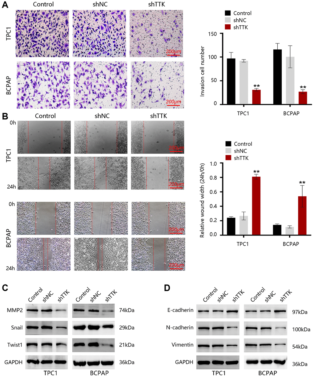 Subsequently, we investigated the role of TTK in PTC cell migration and invasion using wound-healing and transwell assays. The migratory and invasive capacities of TPC1 and BCPAP were inhibited upon TTK knockdown. For validation, we detected the expression of metastasis-related proteins and “EMT master genes”, revealing that TTK might modulate cell migration and invasion through accelerating EMT in PTC cell lines and it might be related to PTC metastasis.