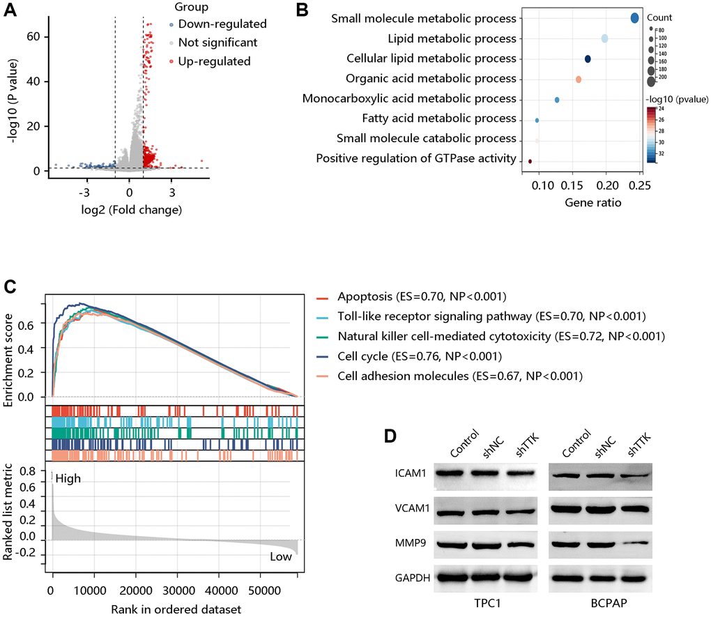To explore the potential signaling pathways regulated by TTK, we identified the DEGs between TTK-H and TTK-L (Figure 8A). We obtained 600 significant DEGs for analyzing the biological processes. As presented in Figure 8B, they mainly participated in the small molecule metabolic process, lipid metabolic process, and fatty acid metabolic process, which is essential in cancer cell migration and invasion. To meet the energy demands of cytoskeletal activity during migration, cells transport metabolic proteins and concentrate energy production to sites of high energy demand [27]. Subsequently, we performed GSEA and observed that the apoptosis, Toll-like receptor signaling pathway, natural killer cell-mediated cytotoxicity, cell cycle, and CAM were enriched in the TTK-H (Figure 8C).