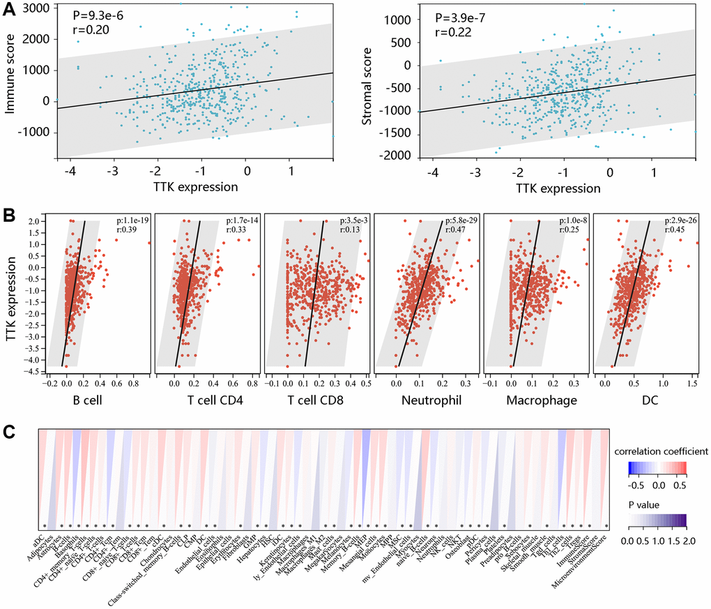 Tumor-infiltrating immune cells play an essential role in tumor occurrence, progression, and metastasis. Thus, the immune score and stromal score were calculated using the ESTIMATE algorithm [25]. Besides, the TIMER and xCELL algorithms were adopted to evaluate the expression correlation of TTK with several immune cells.