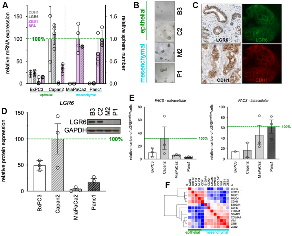 In line with this, flowcytometric intra- (Figure 1E, left) and extra-cellular (Figure 1E, right) LGR6 expression patterns were analyzed. Epithelial subsets showed markedly higher membrane bound LGR6 (up to 10-fold, Capan2 vs. Panc1) and lower cytoplasmic LGR6 expression compared to the mesenchymal cell lines, where proportions were reversed (Figure 1E).