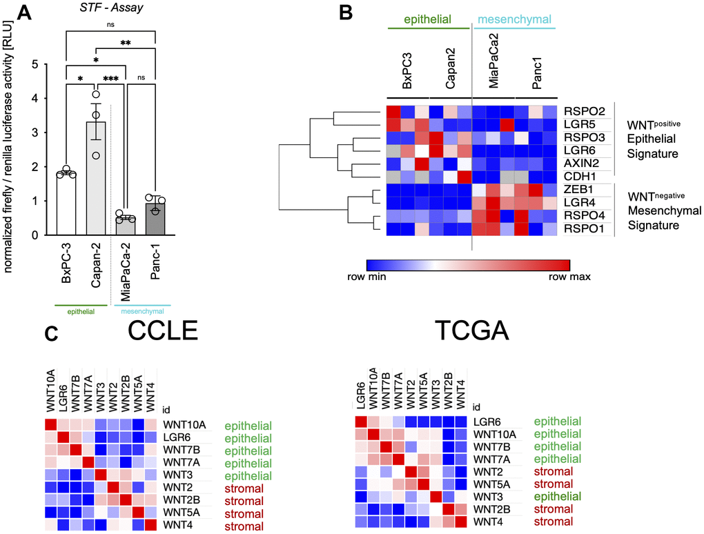 As we could show before, WNT activity is very heterogenous in between different cell types of PDAC as well as different cells of the same cell line [32]. In this work, we show in Super TOP/FOP assays, that BxPC3 and Capan2 (epithelial category) tended to contain higher baseline WNT activity levels (Figure 2A). Clustering of mRNA results revealed an affiliation of LGR6 with WNT target genes AXIN2 and LGR5 as well as RSPO2, RSPO3, and CDH1 what we describe as WNTpositive epithelial signature. In contrast, RSPO1, RSPO4, LGR4, and ZEB1 were highly expressed in mesenchymal cells as part of the WNTnegative mesenchymal signature (Figure 2B). According with this, we analyzed WNT niche subtypes described by Seino and colleagues in CCLE and TCGA datasets. Here, we also found that epithelial WNTs (3, 7A and B, and 10A) clustered strongly with LGR6. This might give hints towards a robust role of LGR6 creating WNT independence in those cell lines (Figure 2C) [35].