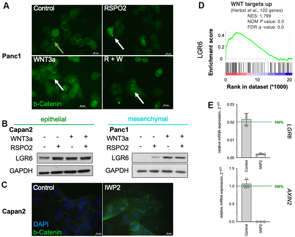 As shown in Figure 3D, we detected decreased β-catenin signal upon IWP2 inhibition in Capan2. Moreover, down-regulation of the WNT target gene AXIN2 in Capan2 corroborated this finding on RNA level (Figure 3E). A reduced LGR6 expression was detected upon the inhibition of WNT activity (Figure 3E). These data suggest that downregulation of WNT signaling might be followed by a reduction of LGR6 expression.
