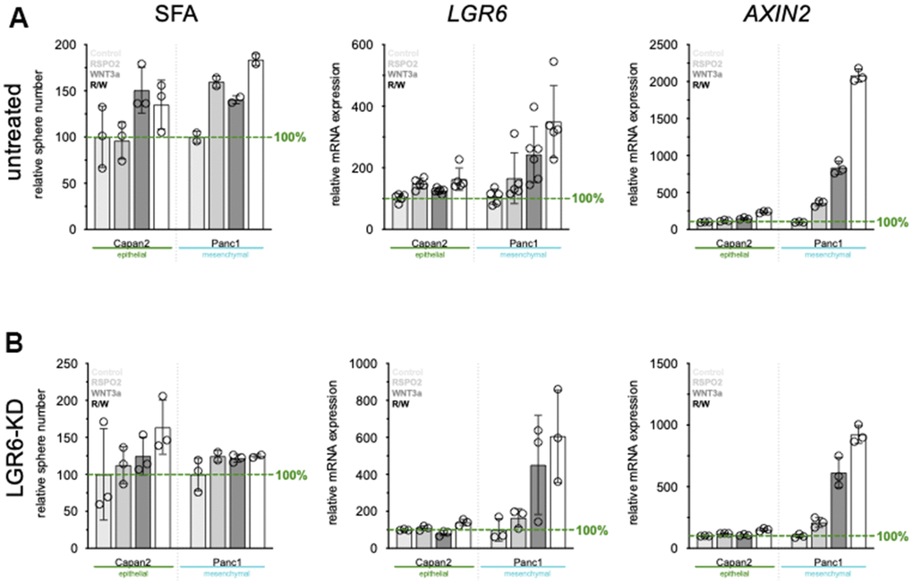 To fully explore functional roles of LGR6 in cancer cell stemness, LGR6 was knocked down by siRNA transfection. Efficient knock down resulted in a 90% decrease in LGR6 mRNA level in comparison to the vector control (Supplementary Figure 4A). Next, we evaluated the effect of LGR6 silencing in PDAC cell lines on their colony formation ability. As shown in Supplementary Figure 4B, colonies were markedly smaller in the siLGR6-transfected group (siLGR6) compared to the vector control (VC). Consistent with this result, SFAs revealed that siLGR6 led to a decrease in spheroid size and number compared with VC (Supplementary Figure 4C). To investigate the role of LGR6 in exogeneous mediation of WNT, we also evaluated SFA, LGR6, and WNT target AXIN2 expression after stimulation with RSPO2 and WNT3a after VC (Figure 4A) or LGR6-KD (Figure 4B) in both Capan2 and Panc1. As expected, SFA, LGR6, and the WNT target gene AXIN2 significantly increased upon RSPO2 and/or WNT3a stimulation, indicating a successful WNT axis activation (Figure 4A). LGR6-KD impeded sphere-formation even after exogeneous WNT stimulation, especially in the more WNT-sensitive cell line Panc1 (Figure 4B). LGR6 and AXIN2 expression were lower, also after exogeneous WNT stimulation; however, both were not completely inhibited suggesting an important, but not all-encompassing role of LGR6 in regulating the canonical WNT axis in PDAC (Figure 4B).