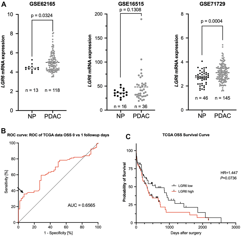 Finally, we tested for clinical correlations of LGR6 mRNA levels in different publicly available data sets with a total of 299 PDAC and 75 normal pancreas (NP) cases. LGR6 expression was significantly higher in PDAC as compared to NP in GSE62165 and GSE71729 with a similar trend in GSE16515 (Figure 5A). Using ROC curve analyses and Youden’s index, we identified an ideal cutoff at a normalized expression intensity of 0.6565 (natural scale) of LGR6 mRNA (Figure 5B). Dichotomal classification revealed a trend of high LGR6 expression and poor overall survival (Figure 5C). Expressed in numbers, median survival of the LGR6 high subgroup was 329 days, whereas LGR6 low led to an increased survival with a median of 584 days. However, the remaining clinical data of the TCGA databank revealed no statistically significant difference (Supplementary Table 3).