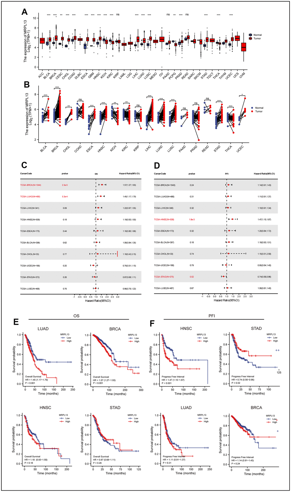 Our findings revealed that the expression level of MRPL13 between tumor and normal tissue is significantly different in many cancers. Specifically, we observed upregulation of MRPL13 in BLCA, BRCA, CESC, CHOL, COAD, ESCA, GBM, HNSC, LIHC, LUAD, LUSC, PRAD, STAD, and UCEC, while KICH, KIRC, PCPG, and HCA exhibited downregulation. To confirm these results at the RNA and protein levels, we utilized PCR, WB, and IHC analysis on our samples and data from public databases for lung adenocarcinoma. Additionally, our analysis of TCGA data indicated that MRPL13 expression is a prognostic indicator for several cancer types, including LUAD, BRCA, HNSC, and STAD. This study is the first to report a correlation between MRPL13 and cancer prognosis across multiple cancer types.