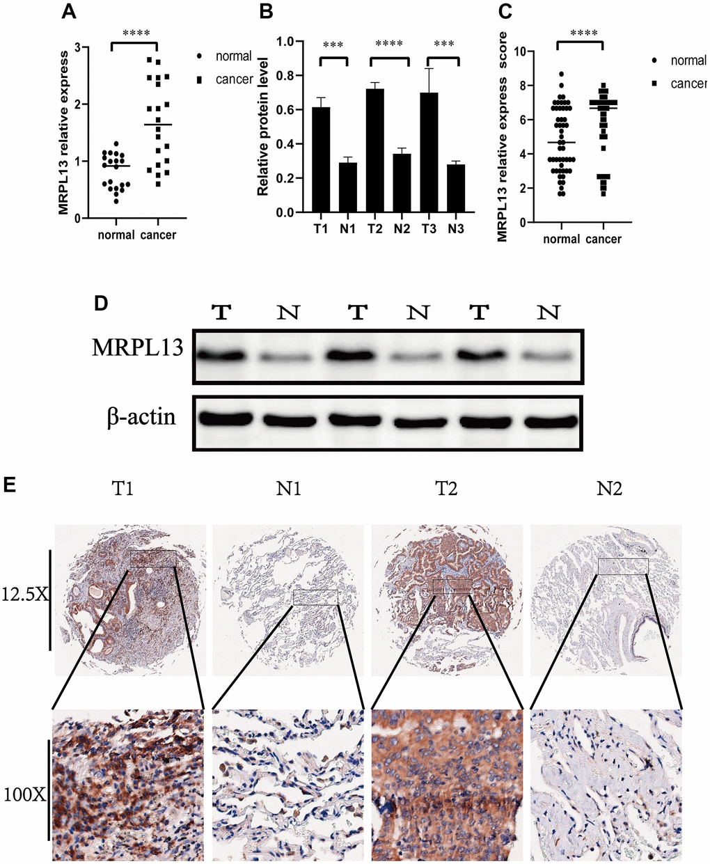 The above analysis results show that the expression level of MRPL13 is not only different between various tumor samples and normal tissues but also leads to the occurrence and development of many cancers. Given the comprehensive nature of these findings and the replication of previous studies, we deemed it necessary to conduct additional experiments to explore its differential expression in lung adenocarcinoma and normal tissues, as well as its general function in lung adenocarcinoma.