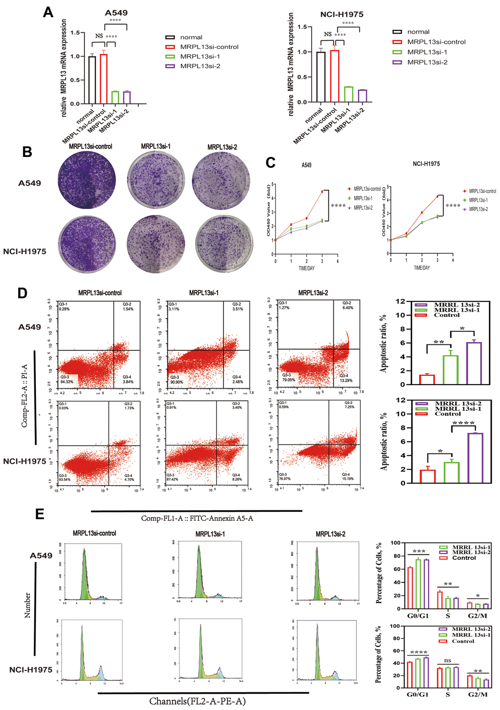 Additionally, MRPL13 knockdown led to a significantly higher percentage of apoptotic cells in both cell lines (Figure 13D). Flow cytometry analysis revealed that MRPL13 knockdown altered the cell cycle distribution in both A549 and NCI-H1975 cells. The percentage of cells in G1 phase in the MRPL13 knockout group increased, while the percentage of cells in S and G2 phases decreased. (Figure 13E). These results revealed that MRPL13 can promote the growth of tumor tissue by regulating the proliferation and apoptosis of lung adenocarcinoma cells.