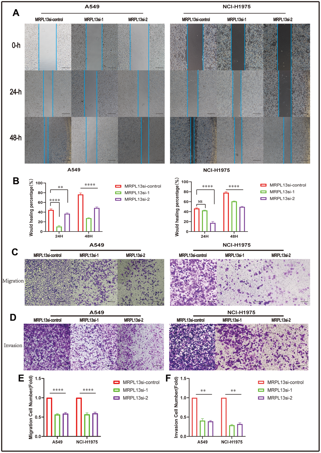 CCK8 assays and colony-forming tests showed that MRPL13 knockdown significantly reduced the proliferation of both A549 and NCI-H1975 cells compared to the control groups (Figure 13B, 13C).