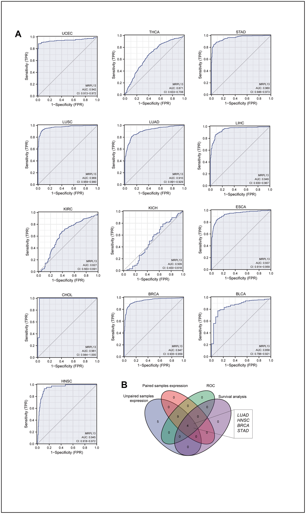 Evaluation of the receiver operating characteristic (ROC) curve confirmed the diagnostic value of MRPL13 across cancers. The AUC value, ranging from 0.5 to 1, measures the accuracy of the diagnostic effect. An AUC of 1 indicates a better diagnostic effect. Analyzing the ROC curve of 13 cancers with differential MRPL13 expression obtained from the TCGA analysis of matched and unmatched samples, we found that the diagnostic accuracy of the AUC analyzed by this model was high in 9 cancers, relatively high in 1 cancer, and low in 2 cancers (Figure 2A). Finally, we constructed a Venn diagram to compare the cancer model with differences among unmatched sample comparison, matched sample comparison, ROC diagnosis model, and survival analysis, which identified BRCA, LUAD, STAD, and HNSC as significant cancers (Figure 2B).