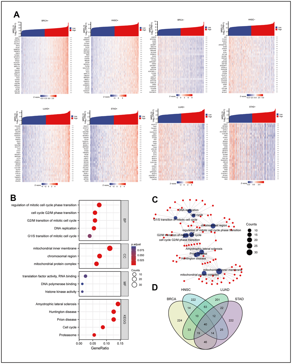 The top 30 positively and negatively correlated genes with MRPL13 were identified in BRCA, LUAD, HANS, and STAD. The intersection of genes coexpressed in two or more cancers was analyzed and extracted, and then the differentially expressed genes were analyzed by gene ontology and KEGG pathway enrichment through algorithms. For example, ELOC, located in the 8q area, can increase the growth rate and invasiveness of prostate cancer cells and is related to the differentiation of hormone resistance in prostate cancer [19], bringing great challenges to the prevention and treatment of prostate cancer. ELOC-mutant RCC can show variable behavior ranging from very indolent to aggressive [20]. Additionally, MRPL15, which belongs to the same family as MRPL13, promotes the malignant progression of non-small cell lung cancer and affects the inhibitory effect of the immune system on tumor cells [21]. C8orf76 directly binds to carcinogenic lncRNA, induces its expression, and activates the MAPK signal. C8orf76 plays a crucial role in the occurrence of gastric cancer and can serve as an independent prediction model to evaluate the clinical outcome of patients with gastric cancer [22]. NUDCD1, ENY2, PNO1, CCT4 and PSMD14 are considered to promote the proliferation, invasion and treatment resistance of tumor cells in a variety of cancers, including pancreatic cancer, rectal cancer, liver cancer, breast cancer, glial cancer and head and neck squamous cell carcinoma [23–26]. Furthermore, nivolumab (NIVO) can also protect tumor cells from treatment by upregulating several genes, including DCAF13 [27]. Moreover, MRPL13 can also promote the malignant progression of tumors by inhibiting the expression of protective genes, such as NIFX and CBX7 [28, 29]. All of these results indicate that the MRPL13 gene may interact with many genes and play a role in multiple cancers through various pathways, which is an interesting phenomenon that warrants further investigation. The enrichment analysis of biological processes indicates that MRPL13 may regulate mitotic cell cycle phase transition, cell cycle regulation, and DNA replication across cancers. These pathways have been mentioned in previous studies [30]. The enrichment analysis of cellular components suggests that MRPL13 is related to mitochondrial intima and mitochondrial protein complexes, as well as translation factor activity and RNA binding. Other enriched pathways included amyotrophic lateral sclerosis and Huntington disease. These findings indicate that MRPL13 can not only affect the tumor process itself but also form a complex regulatory network by regulating coexpressed genes and ultimately promote the formation and development of tumors.