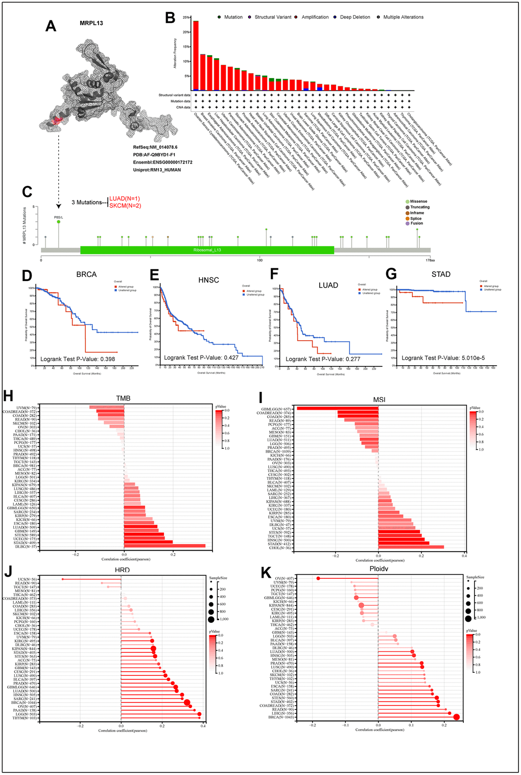 In general, MRPL13 acts as a potential marker of genomic stability in a variety of cancer species, including LUAD, and affects patient prognosis and therapeutic responses.