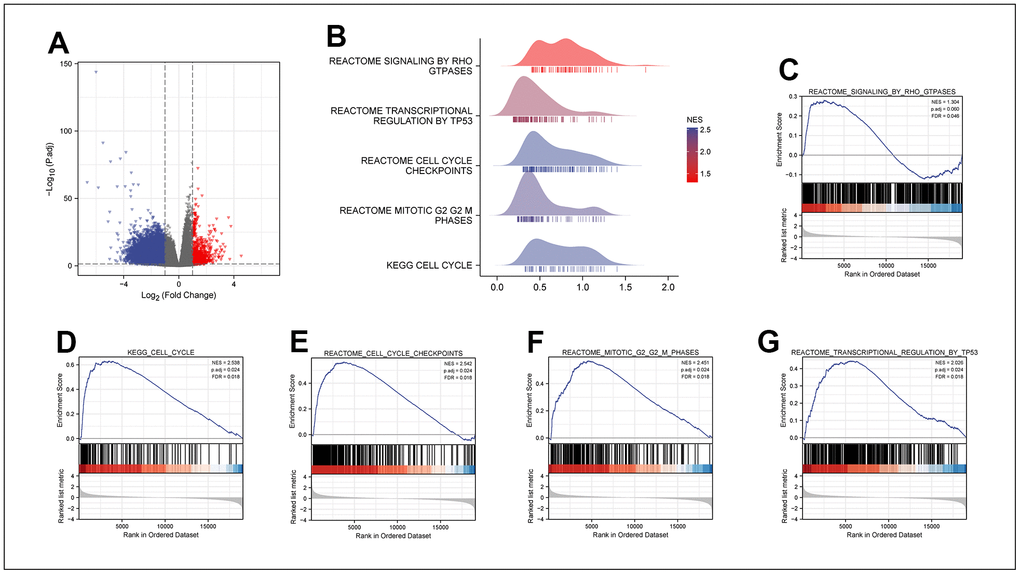 After analyzing the MPRL13 expression count of LUAD patients in the TCGA database. All LUAD patients were divided into high and low expression groups with the median MRPL13 expression as the critical point. By using R language DEseq2, the differentially expressed genes of the two groups were extracted (Log FC > 1, P < 0.05) and visualized by using a GGPLOT2 volcanic map (Figure 5A). Second, the differentially expressed genes were subjected to GSEA. The differentially expressed genes between the two groups were significantly enriched in several biological pathways, including REACTOME SIGNALING by RHO GTPASES, REACTOME TRANSCRIPTIONAL REGULATION by TP53, REACTOME CELL CYCLE CHECKPOINTS, REACTOME MITOTIC G2/G2 M PHASES, and KEGG CELL CYCLE (Figure 5B–5G). Based on the above results, we speculate that MRPL13 may participate in the regulation of tumor occurrence and development by affecting the cell cycle.