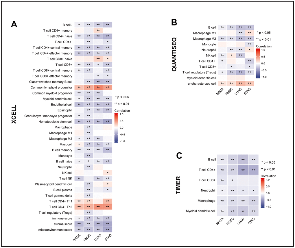 In this study, we utilized three algorithms from various databases, TIMER, QUANTISEQ, and XCELL, to investigate the relationship between MRPL13 and immune cell infiltration patterns in different types of cancer. Moreover, we utilized the ssGSEA algorithm embedded in the GSVA package in R language to analyze the immune cell infiltration model based on the high and low expression of MRPL13 in BRCA, LUAD, HNSC, and STAD in TCGA. The data on immune cells were obtained from a published article [12]. Additionally, we used TISIDB analysis to identify five immune subtypes in BRCA, LUAD, STAD, and HNSC.