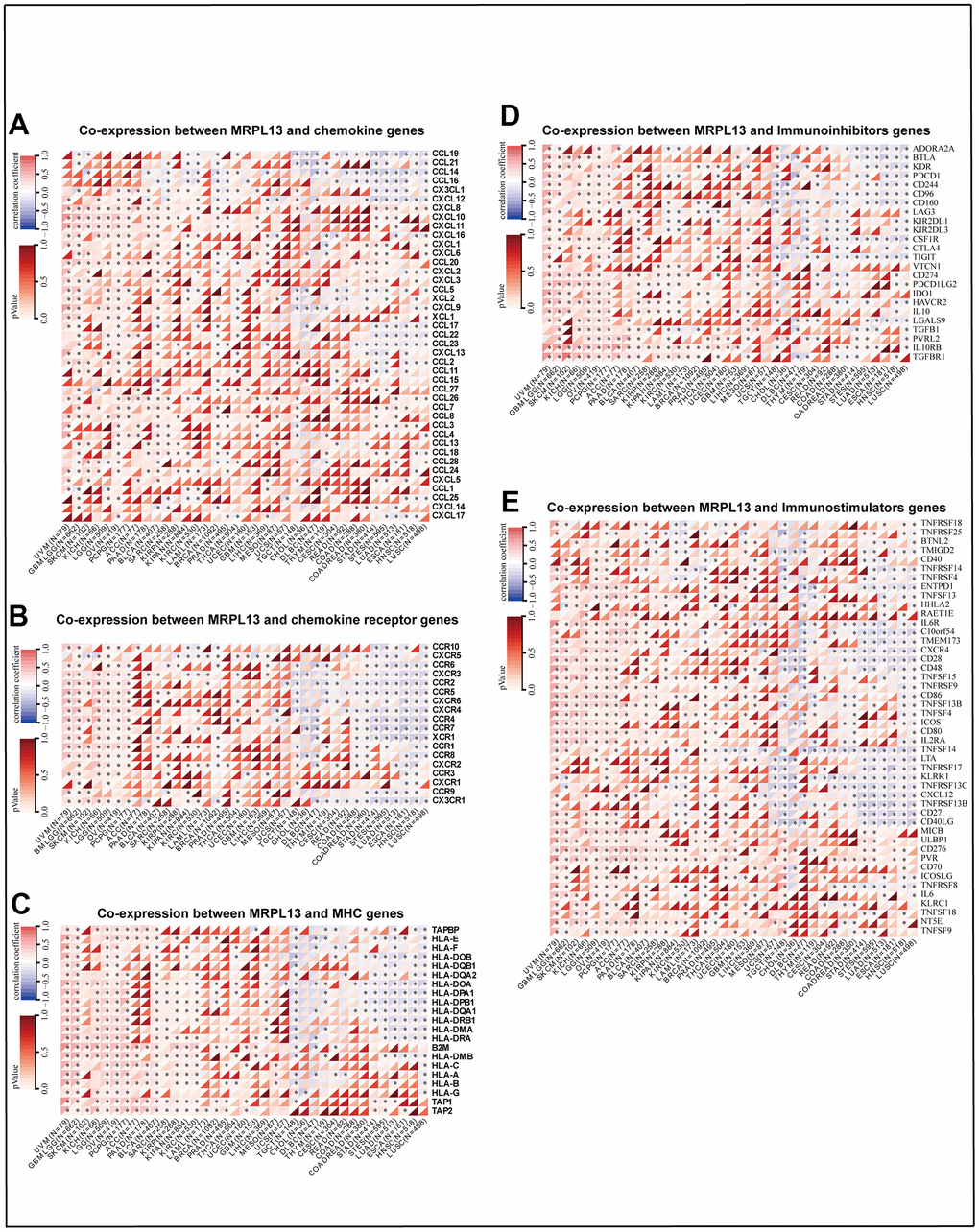 Chemokine genes, chemokine receptor genes, MHC-related immune pathway marker genes, immunosuppressant genes, and immunostimulant genes were collected from a standardized ubiquitin gene expression dataset. The coexpression relationship between MRPL13 and immune genes in pan-cancer was inferred using the R package “limma” and determined using the Pearson statistical method.