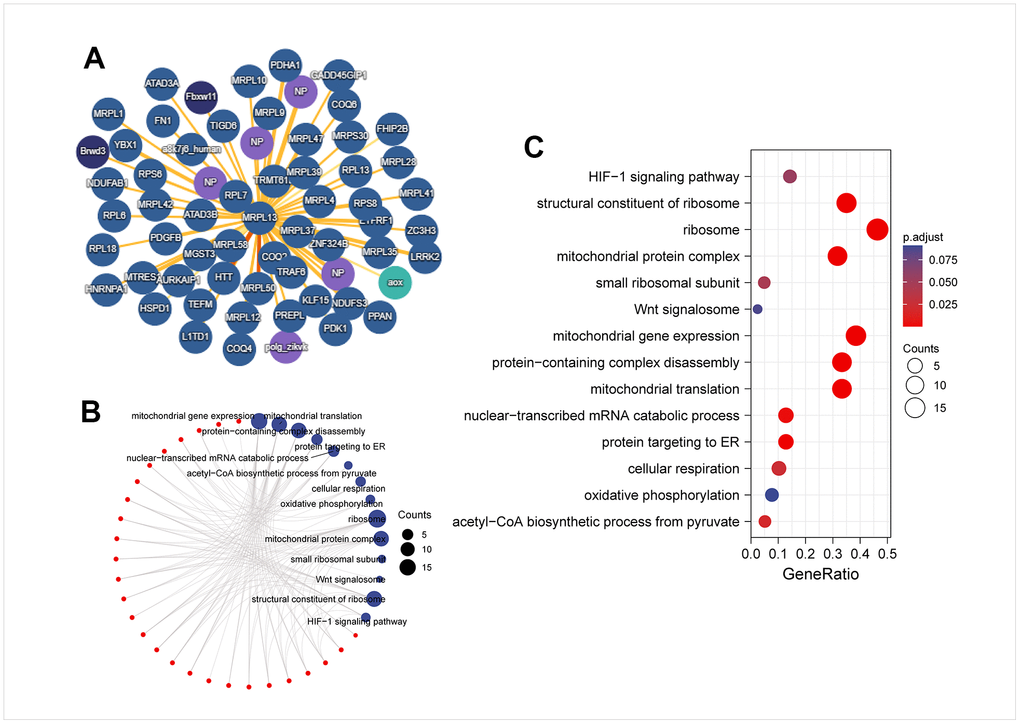 We used the IMEX database to identify the targeted binding protein of MRPL13 (Figure 8A). Subsequently, we analyzed the KEGG/GO enrichment of these targeted binding proteins and found that they mainly participate in several biological processes for instance mitochondrial gene expression, protein complex disassembly, and mitochondrial translation. The molecular function analysis revealed involvement in nuclear-transcribed mRNA catabolic process and protein targeting to the endoplasmic reticulum. The cellular component analysis indicated an association with ribosomes and mitochondrial protein complexes. Moreover, KEGG analysis showed that MRPL13 binding proteins were mainly involved in cellular respiration and the acetyl-CoA biosynthetic process from pyruvate (Figure 8B, 8C).