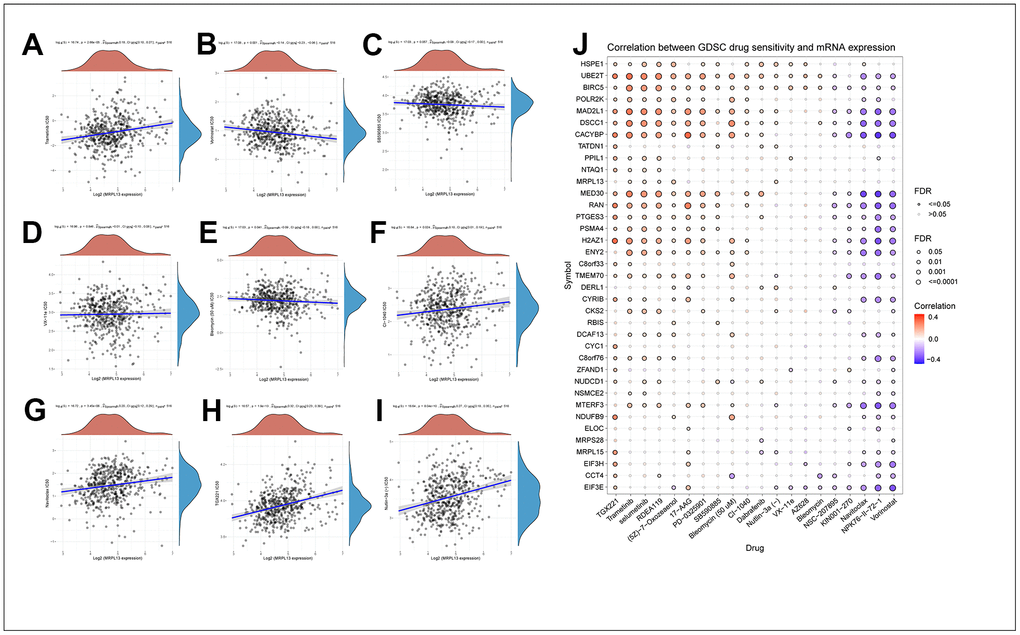 Furthermore, by drawing a correlation heatmap between MRPL13-related genes and the sensitivity to 20 common drugs, we found a direct proportion between MRPL13 and most related gene expression levels and the sensitivity to TGX221, trametinib, and selumetinib and an inverse proportion to navitoclax, NPK76-II-72-1, vorinostat, and other drugs (Figure 9J). These findings demonstrate the crucial role that MRPL13 and its related genes play in influencing drug treatment sensitivity, which suggests potential targeted therapies for cancer through MRPL13 and related genes.