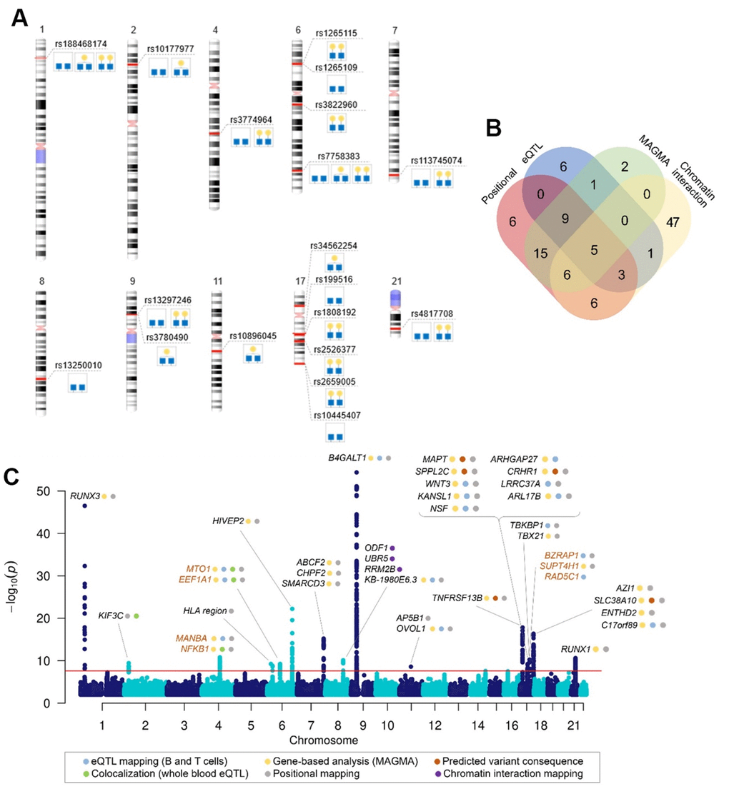 Given that the majority of identified candidate SNPs are located in non-coding regions, we applied several in silico approaches to prioritize potential causal genes in associated genomic regions, including exploring functional consequences of associated variants, pleiotropy with gene expression, gene-based association analysis, as well as evidence from previous GWA studies and prior biological knowledge of gene function. Among 37 candidate genes from 16 associated loci, for the two genes, RUNX3 and B4GALT1, the effect on IgG glycosylation has recently been demonstrated using direct gene expression modulation in HEK293FS IgG transient expression system [35, 43].