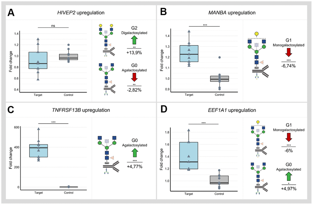Utilizing dCas9-VPR cell line and three gRNAs for each locus, we successfully upregulated all selected loci except SLC38A10 and HIVEP2 (Supplementary Figure 3A and Supplementary Table 4). Successful downregulation in the dCas9-KRAB cell line was accomplished using three gRNAs for all selected loci except NFKB1 and HIVEP2 (Supplementary Figure 3B). A significant change of IgG glycome composition was observed after dCas9-VPR targeting of HIVEP2, MANBA, TNFRSF13B and EEF1A1 (Figure 2 and Appendix Table 6). Interestingly, manipulation of the HIVEP2 promotor did not upregulate HIVEP2 transcript level sufficiently to reach statistical significance at transcript level, but it resulted in a significant increase of digalactosylated structures and a concomitant decrease of agalactosylated structures on IgG (Figure 2A). Upregulation of the MANBA locus resulted in a significant decrease of monogalactosylated IgG glycans, but no change in levels of agalactosylated and digalactosylated glycans was observed (Figure 2B). Targeting TNFRSF13B in dCas9-VPR cell line resulted in almost 400-fold increase of its expression and a moderate increase in agalactosylated IgG glycans (Figure 2C). Upregulation of the EEF1A1 locus resulted in a significant decrease of monogalactosylated glycans and in a concomitant increase of agalactosylated IgG glycans (Figure 2D).