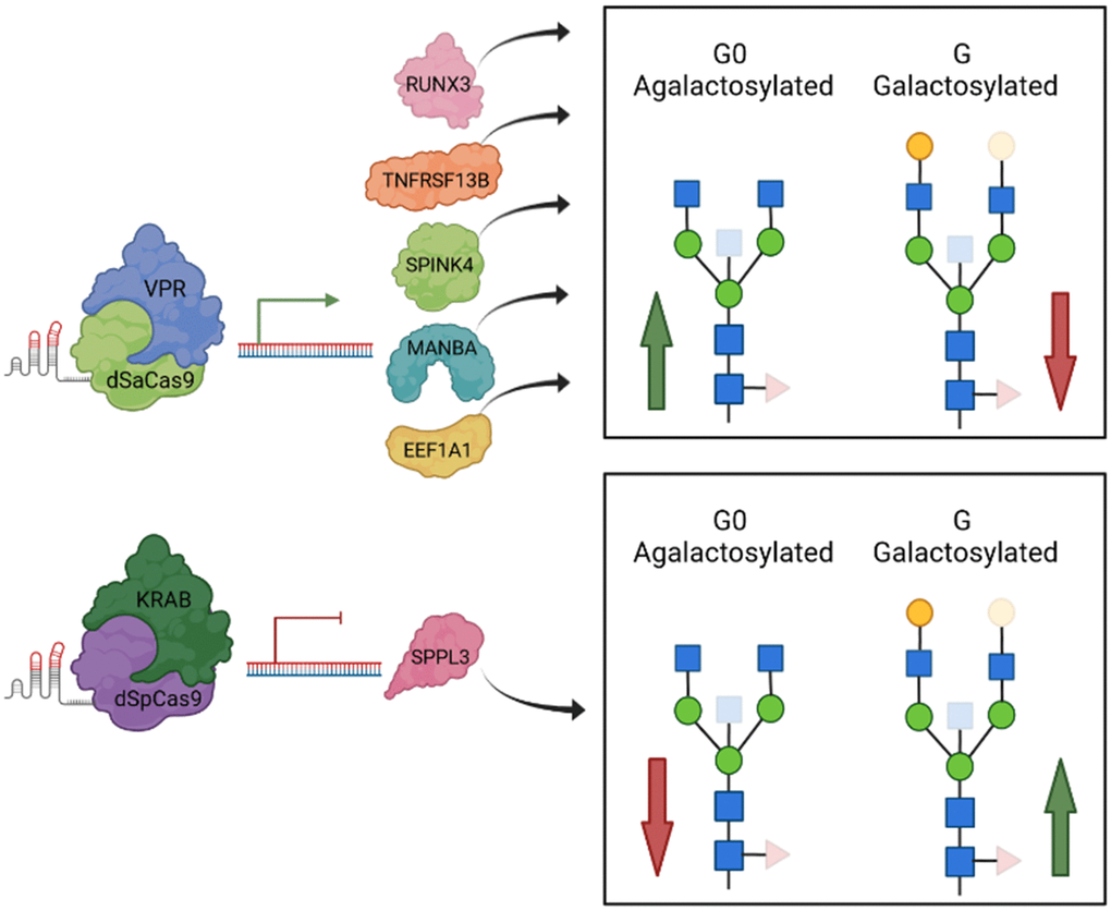 To functionally validate the potential role of the selected GWAS hits in IgG galactosylation, we used the newly developed transient expression system HEK293FS for IgG production with stably integrated dSaCas9-VPR or dSpCas9-KRAB expression cassettes for target gene upregulation or downregulation [35]. Therefore, the candidate genes were manipulated in dCas9-VPR or dCas9-KRAB containing monoclonal cell lines transiently transfected with a plasmid carrying genes for IgG heavy and light chains and specific gRNA. Subsequently, secreted IgG was analysed for glycan phenotype.