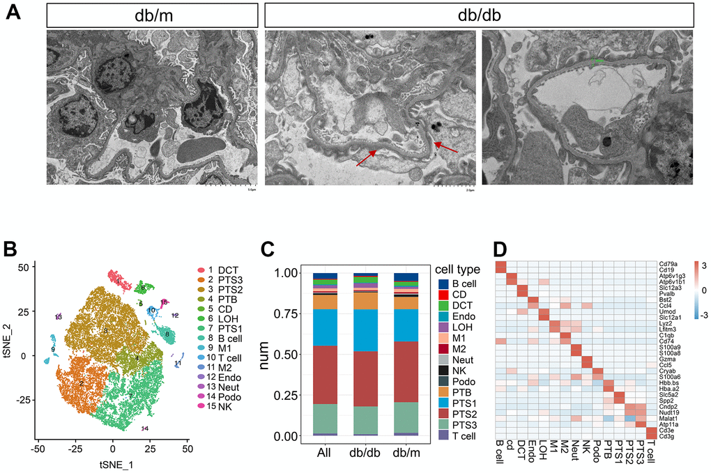 We performed scATAC-seq on kidneys of 16-week-old db/db and db/m mice to characterize the accessible chromatin landscape of kidneys stimulated by hyperglycemia. Transmission electron microscopy (TEM) revealed obvious structural changes in db/db mouse kidneys compared to those in db/m mouse kidneys, including increased accumulation of the extracellular matrix, thickened basement membrane, and fusion of foot processes. (Figure 1A). A total of 42,833 cells from six kidneys obtained from three db/db and three db/m mice were processed for scRNA-seq on the 10× Genomics Chromium platform, with an average of 57,099 reads per cell. After quality control, 32,058 cells were included in the analysis (Supplementary Table 1), comprising approximately 13,906 cells from db/db mice and 18,152 cells from db/m mice, with an average of 2,096 genes per cell.