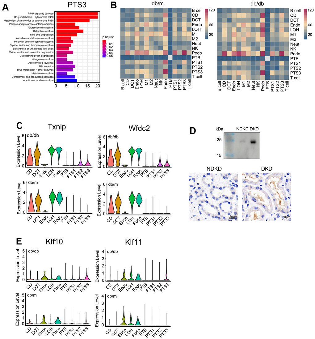 Under DKD conditions, signaling pathways such as PPAR, TGF-β, MAPK, and NLRP3 are activated in the renal tubules, and they transition from adaptive to pathological changes. We observed that klf10 and klf11, which encode factors involved in the TGF-β signaling pathway [21] and inhibit cell growth, regulating extracellular matrix, and inducing cell apoptosis [22, 23] are significantly upregulated in the proximal tubules. Consistently, the cell numbers in the PTS3 and PTS2 clusters were significantly lower in db/db mice than in db/m mice, this could be attributed to increased Klf10 and Klf11 expression. Additionally, the expression of Txnip, which can promote inflammatory in high glucose environment [24] and Arg2, which can induce the production of reactive oxygen species [25], were also significantly higher in db/db mice. As renal tubular pathological changes progress, expression of the renal tubular fibrosis protein Wfdc2 was significantly increased in both db/db mice and the urine and kidneys of patients with DKD. Wfdc2 may function as a protease inhibitor, which can inhibit serine protease activity and slow down the degradation of type I collagen, thereby promoting renal fibrosis [26]. These results indicate there are significant pathological changes in the kidney in DKD.