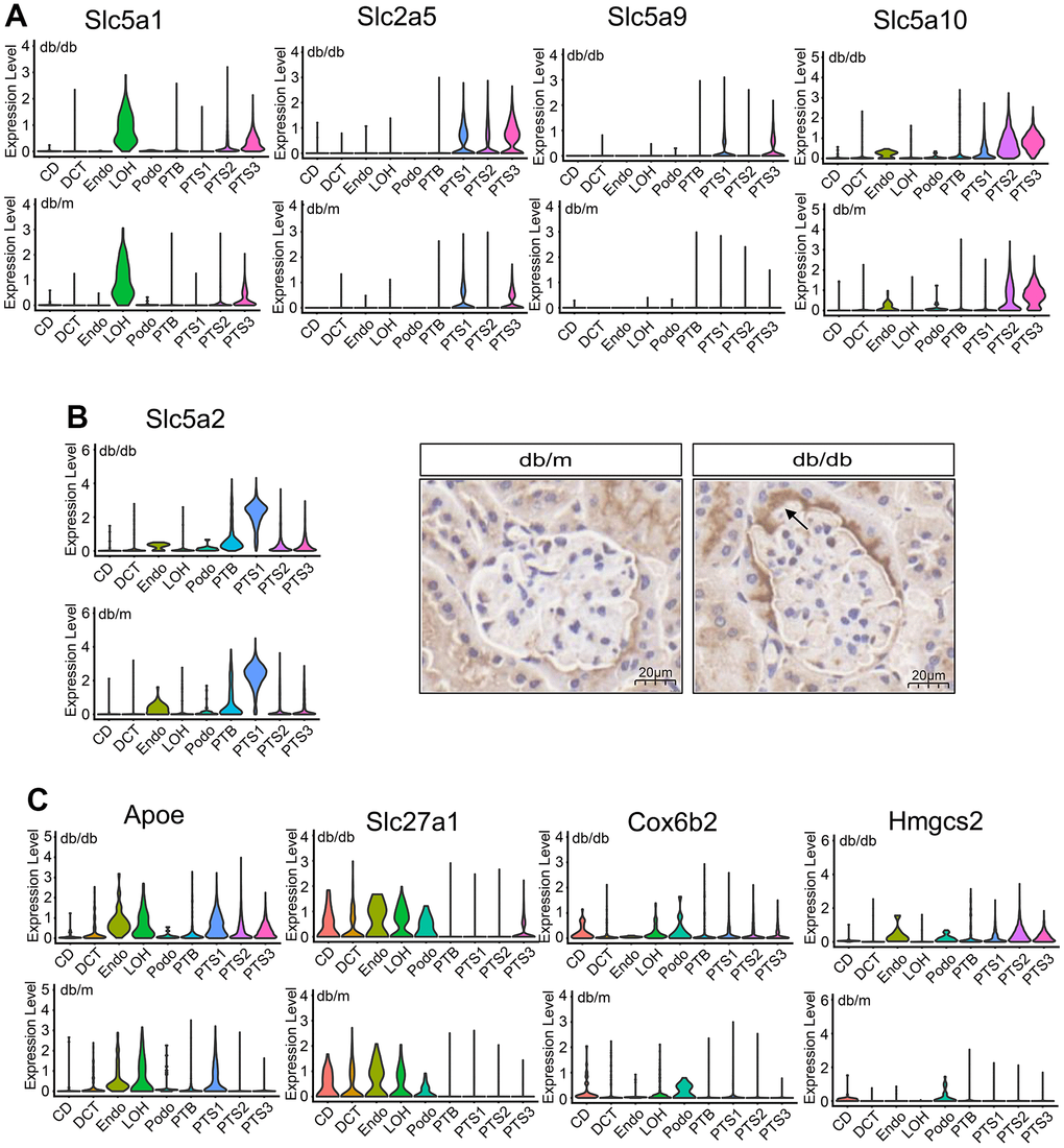 Regarding lipid transport, Apoe expression level significantly increased in the proximal tubules and that of Slc27a1 significantly increased in the PTS3 cluster of db/db mice than that of db/m mice (P<0.01) (Figure 3C). Additionally, the expression of Cox6b2, involved in the oxidative phosphorylation of glucose, significantly increased in db/db mice compared with that in db/m mice (P<0.01), especially in the proximal tubules, CD, and LOH (Figure 3C). Hmgcs2, which is involved in ketogenesis, was also highly expressed in the proximal tubules, endothelial cells, and podocytes of the kidneys of db/db mice compared with that in db/m mice (P<0.01, Figure 3C). Conversely, the expression levels of the amino acid transporters Slc1a1, Slc3a1, and Slc13a1 were lower in the proximal tubules of db/db mice than in those of db/m mice (P<0.01, Supplementary Figure 3C). Transporters related to sugar and ketone metabolism were highly expressed in db/db mice; however, the expression of some key amino acid transporters decreased. These data suggest that db/db mice undergo metabolic remodeling, manifested as metabolic changes in glycolipid and amino acid levels.
