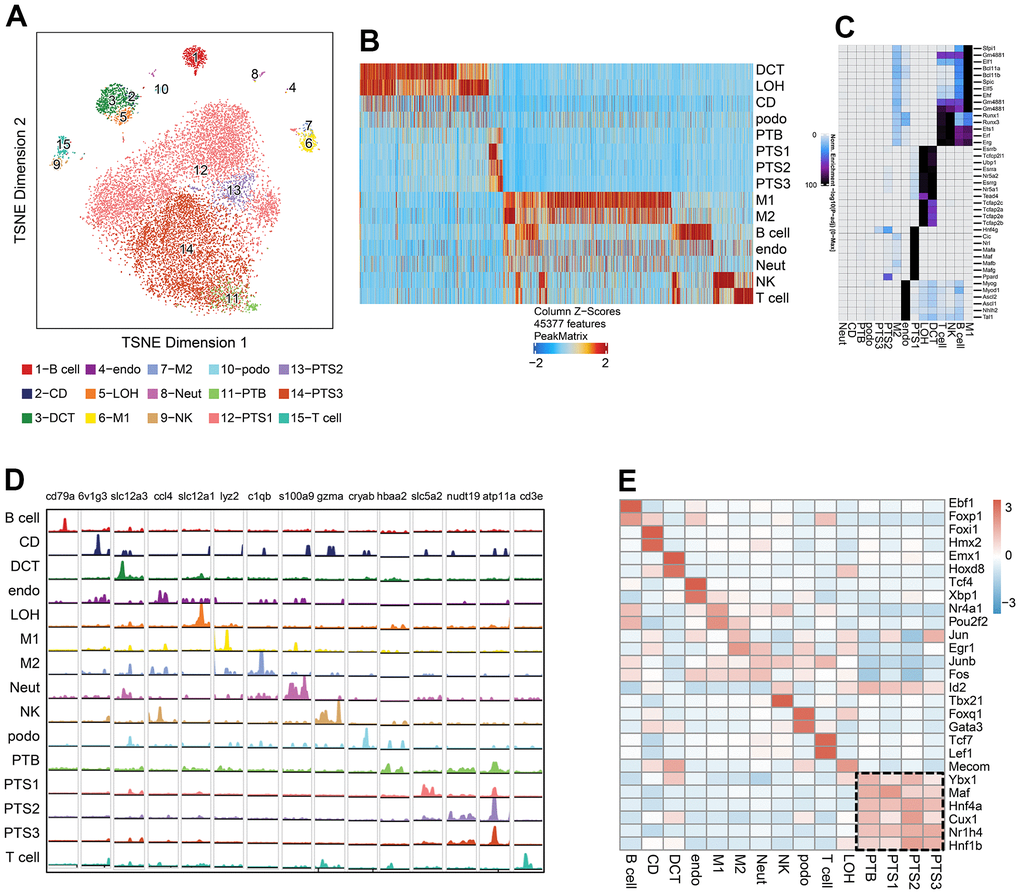 We sequenced 16,660 cells from the kidneys of 3 db/db and 3 db/m mice, with an average of 7,069 fragments per cell; 14,968 cells were screened for further analysis after quality control. The cells from scATAC-seq were annotated as 15 clusters under the reference of defined cell types from the scRNA-seq data, which were visualized using tSNE (Figure 4A). We identified 85,212 differentially accessible open chromatin peaks (DAPs) across the 15 cell types (Figure 4B and Supplementary Table 5). The expression of 884 cell type specific TFs which are likely to bind to regions of high chromatin accessibility across the 15 clusters was observed (Figure 4C and Supplementary Table 6).