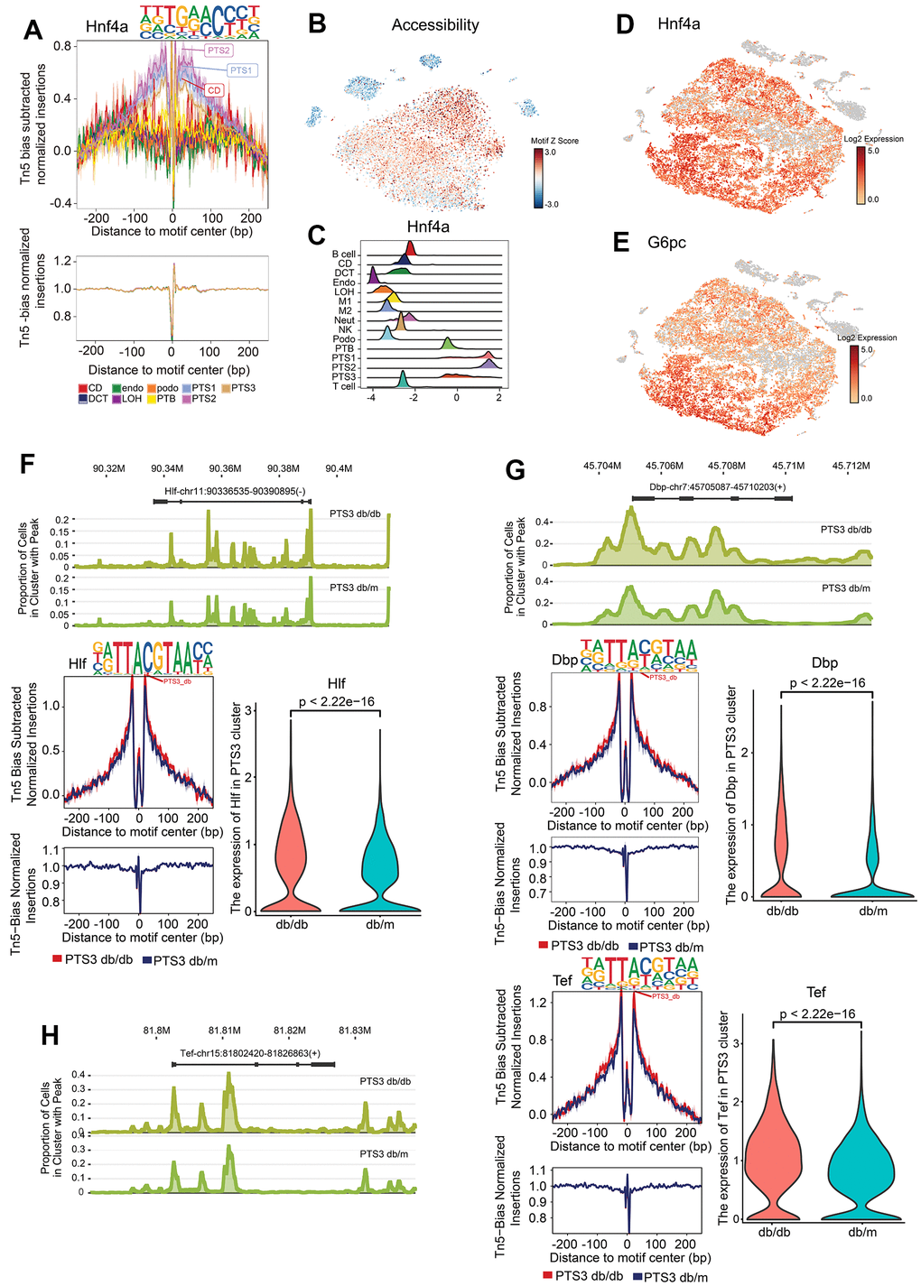 Hepatic leukemia factor (Hlf), D site-binding protein (Dbp), and thyrotroph embryonic factor (Tef) were found to bind to the regions with high chromatin accessibility in the PTS3 cluster of db/db mice more than that in db/m mice (P<0.01, Figure 5F–5H). Hlf, Dbp, and Tef belong to the PAR-domain basic leucine zipper (PAR bZip) family and serve as the output executors of the biological clock [15, 16].