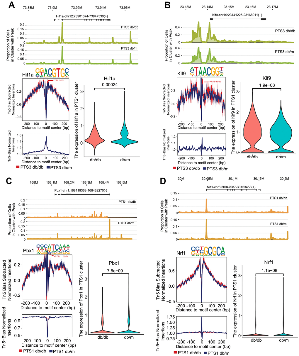 Hypoxia-inducible factor 1-alpha (Hif1α) and Kruppel-like factor 9 (Klf9) showed higher chromatin accessibility of their promoter regions in the PTS3 cluster of db/db mice than in those of db/m mice (P<0.01, Figure 6A, 6B). Nuclear respiratory factor 1 (Nrf1) and pre-B-cell leukemia transcription factor 1 (Pbx1) showed lower chromatin accessibility of their promoter regions in the PTS1 cluster of db/db mice than in those of db/m mice (P<0.01). Pbx1 is necessary for renal development and is involved in the activation of the nephrin promoter in the proximal tubules [17], while Nrf1 acts as a cytoprotective factor in cells and plays a regulatory role in diabetes by modulating the level of glutathione [18] (Figure 6C, 6D).