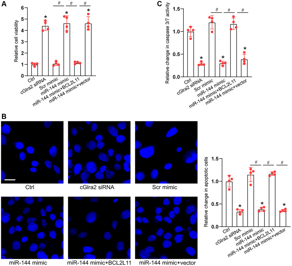 As miR-144 was sponged by cGlra2, we then investigated the role of miR-144 in RGC biology. Under oxidative stress, CCK-8 assays demonstrated that compared with Ctrl group (H2O2 treatment alone), transfection of miR-144 mimics significantly enhanced the viability of RGCs and alleviated oxidative stress-induced reduction of RGC viability, which could mimic the effects of cGlra2 silencing on RGC function. By contrast, overexpression of BCL2L11 but not null vector could interrupt the effects of miR-144 mimic on RGC viability (Figure 10A). Hoechst staining assays showed that compare with Ctrl group (H2O2 treatment alone), transfection of miR-144 mimics decreased the number of condensate and fragmented nuclei in RGCs, mimicking the effects of cGlra2 silencing, while overexpression of BCL2L11 could interrupt the protective effects of miR-144 mimics on RGC function (Figure 10B). Caspase 3/7 activity assays demonstrated that transfection of miR-144 mimics significantly reduced the activity of caspase 3/7, showing a similar effect as cGlra2 silencing. By contrast, overexpression of BCL2L11 interrupted the effects of miR-144 mimics on RGCs (Figure 10C). Under hydrostatic stress, transfection of miR-144 mimic alleviated hydrostatic stress-induced reduction of RGC viability, decreased the number of condensate and fragmented nuclei, and reduced the activity of caspase 3/7, showing a similar effect as cGlra2 silencing. By contrast, overexpression of BCL2L11 could interrupt the effects of miR-144 mimics on RGC functions (Supplementary Figure 5).