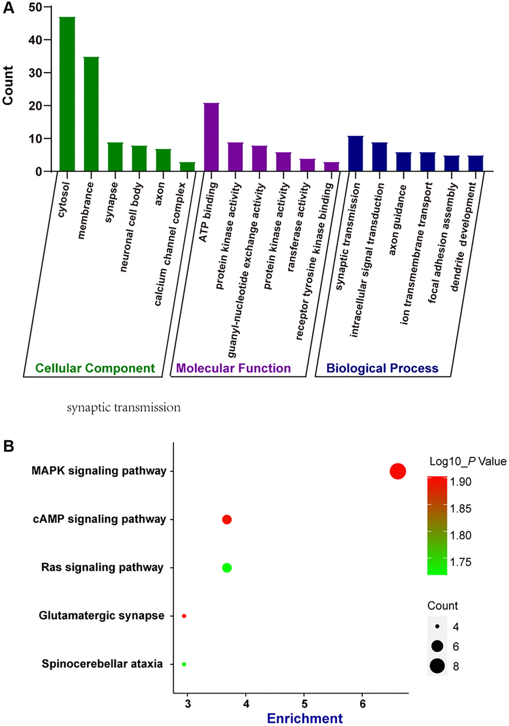 circRNAs are often produced from the parental genes via back-splicing. The functions of circRNAs may be predicted by the functions of their parental genes [14]. Here, we conducted GO enrichment analysis and KEGG pathway analysis of the parental genes of the dysregulated circRNAs during retinal neurodegeneration, which may provide great insights into the functions of circRNAs. GO enrichment analysis showed the enriched biological process (BP), cellular component (CC), and molecular function (MF) terms of the parental genes of dysregulated circRNAs. The top 5 enriched GO terms are shown in Figure 3A. The most enriched CC terms were related to cytosol. ATP binding was shown as the most enriched and meaningful MF term. As for BP, synaptic transmission was identified as the most enriched term. These results suggest that the parental genes of dysregulated circRNAs were tightly associated with cytosol, ATP binding, and synaptic transmission during retinal neurodegeneration. We further conducted KEGG analysis to identify the most enriched signaling pathways involved in dysregulated circRNAs-mediated network. The most enriched pathway was MAPK signaling pathway (Figure 3B), suggesting that the parental genes of dysregulated circRNAs during retinal neurodegeneration were enriched in MAPK signaling pathway.