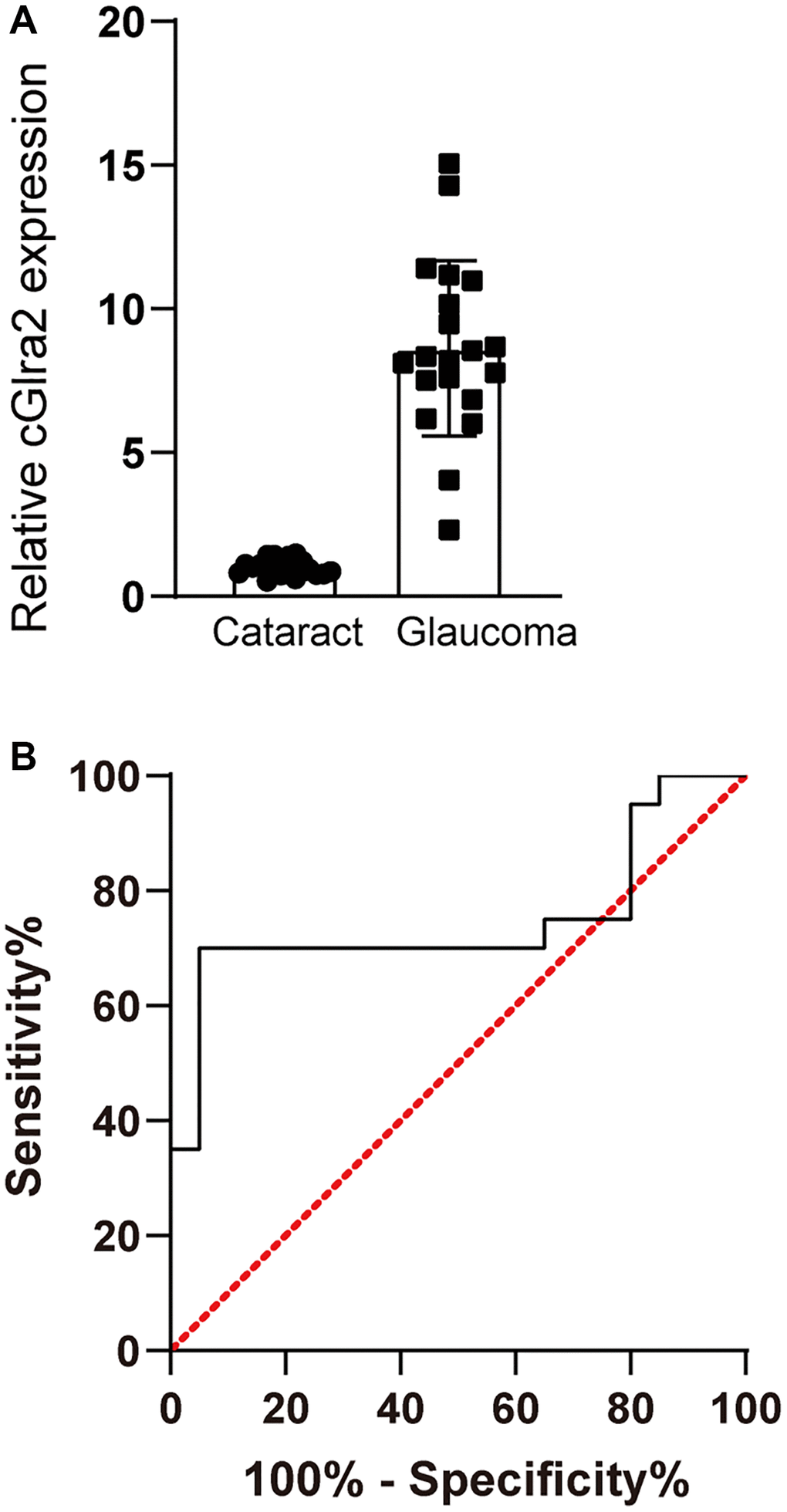 Glaucoma is a retinal neurodegenerative disease characterized by optic nerve injury and RGC loss (Chang and Goldberg, 2012). We collected AH samples from the patients with glaucoma (n = 20) or the patients with cataracts (n = 20) undergoing surgery. The baseline demographics and characteristics of the involved patients were shown in Supplementary Table 2. cGlra2 levels in AH samples of glaucoma patients were significantly up-regulated compared with that in cataract patients (Figure 4A). ROC curves were generated for cGlra2. The specificity, sensitivity, and AUC (area under the curve) of cGlra2 for diagnosing glaucoma were 82.4%, 76.2%, and 0.75 (Figure 4B). Collectively, these results indicate that detection of cGlra2 level has a great potential for the diagnosis of glaucoma.