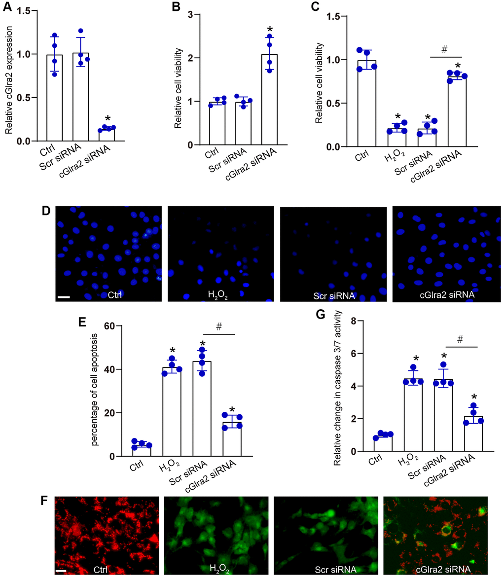 RGCs were transfected with cGlra2 siRNA to alter the levels of cGlra2 expression. qRT-PCR assays demonstrated that the levels of cGlra2 expression were markedly reduced following the transfection of cGlra2 siRNA in RGCs (Figure 5A). Under normal condition, CCK-8 assays demonstrated that transfection of cGlra2 siRNA led to a slight increase in the viability of RGCs (Figure 5B). Then, RGCs were exposed to H2O2 (100 μmol/L) to mimic the oxidative stress in the pathogenesis of glaucoma. CCK-8 assays showed that H2O2 treatment led to a marked reduction of RGC viability, while silencing of cGlra2 by the transfection of cGlra2 siRNA could alleviate oxidative stress-induced reduction of RGC viability (Figure 5C). Hoechst staining assays revealed that H2O2 treatment led to increased condensation and fragmentation of nuclei in RGCs, while silencing of cGlra2 significantly reduced the number of the condensate and fragmented nuclei in RGCs upon oxidative stress (Figure 5D, 5E). JC-1 staining showed that oxidative stress led to reduced mitochondrial depolarization in RGCs as shown by increased green signaling, while silencing of cGlra2 could reverse oxidative stress-induced reduction of mitochondrial depolarization as shown by increased red signaling (Figure 5F). Caspase 3/7 activity assay showed that silencing of cGlra2 could reverse oxidative stress-induced enhancement of caspase 3/7 activity (Figure 5G). Collectively, silencing of cGlra2 can protect against oxidative stress-induced RGC injury in vitro.
