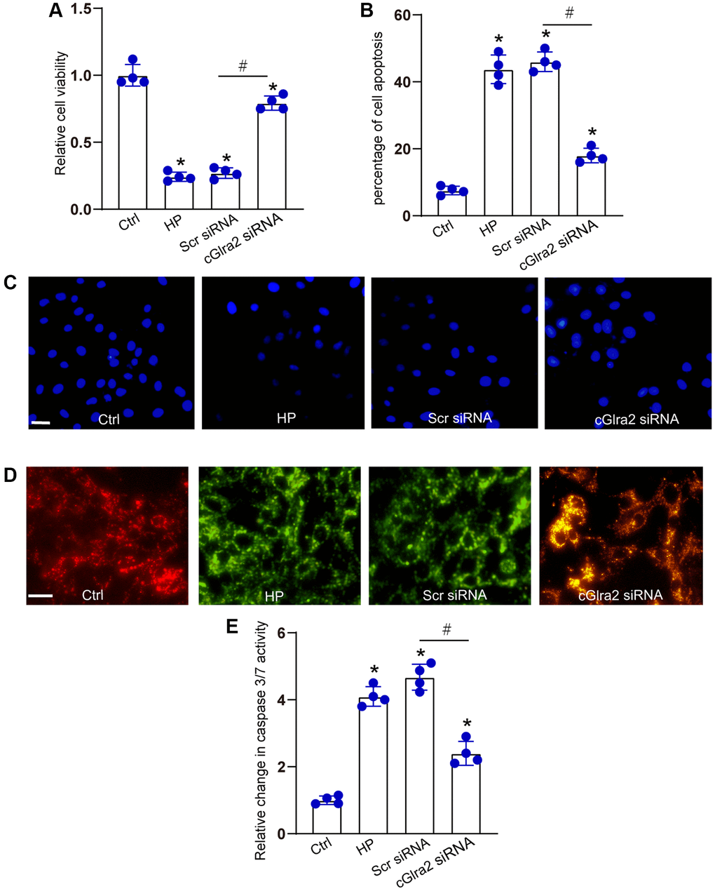 IOP is regulated by the production and outflow of aqueous humor. Excessive aqueous humor in glaucoma can lead to elevated hydrostatic pressure and induce RGC apoptosis [28, 37]. We then determined the effects of cGlra2 silencing on hydrostatic pressure-induced RGC injury in vitro. RGCs were maintained under the elevated hydrostatic pressure (70 mm Hg) to induce hydrostatic stress. RGCs maintained at ambient pressure were taken as the control group. CCK-8 assays demonstrated that transfection of cGlra2 siRNA alleviated hydrostatic stress-induced reduction of RGC viability (Figure 6A). Hoechst staining assays showed that hydrostatic stress significantly increased the number of the condensate and fragmented nuclei in RGCs, while silencing of cGlra2 could reduce the number of condensate and fragmented nuclei induced by hydrostatic stress (Figure 6B, 6C). JC-1 staining showed that hydrostatic stress led to decreased mitochondrial depolarization in RGCs, but silencing of cGlra2 reversed hydrostatic stress-induced reduction of mitochondrial depolarization (Figure 6D). Caspase 3/7 activity assays revealed that silencing of cGlra2 reduced hydrostatic stress-induced enhancement of caspase 3/7 activity (Figure 6E). Collectively, silencing of cGlra2 can protect RGCs against hydrostatic stress-induced injury in vitro.