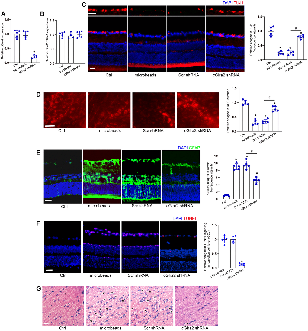 Immunofluorescence staining revealed that compared with scrambled shRNA-injected retinas, injection of cGlra2 shRNA reduced the degree of ocular hypertension-induced RGC injury as shown by increased TUJ1 staining (Figure 7C). We further conducted retinal whole-mount immunofluorescence to detect the survival status of RGCs. The results also demonstrated that injection of cGlra2 shRNA contributed to RGC survival as shown by increased RGC number compared with scrambled shRNA-injected retinas (Figure 7D).