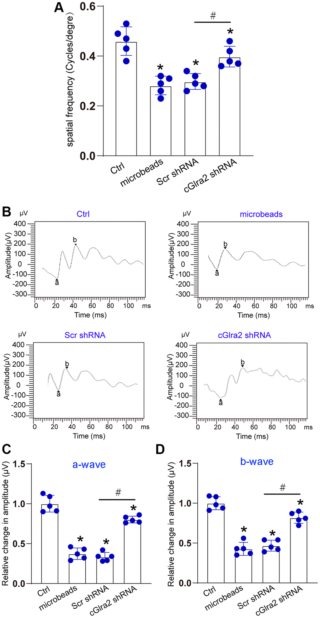 The visual acuity of each group was measured by a simple staircase method to determine the highest level of spatial frequency visible to each mouse. Compared with control group, ocular hypertension led to a marked reduction of visual acuity. Injection of cGlra2 shRNA but not scrambled shRNA partially reversed the reduction of visual acuity induced by ocular hypertension (Figure 8A). Electroretinography assays were conducted to detect retinal function. The results showed that ocular hypertension induced by microbeads-injection led to reduced amplitude of a-wave and b-wave. Injection of cGlra2 shRNA but not scrambled shRNA reversed ocular hypertension-induced reduction of the amplitude of a-wave and b- wave as shown by greater a-wave and b-wave amplitude compared with microbeads-injected group, suggesting that cGlra2 silencing alleviates retinal dysfunction induced by ocular hypertension (Figure 8B–8D).