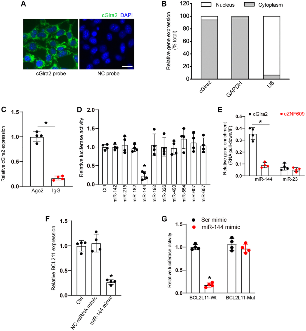 qRT-PCR assays and FISH assays revealed that cGlra2 was mainly expressed in the cytoplasm of RGCs (Figure 9A, 9B). Ago2 protein is a crucial component of RNA-induced silencing complex, which can bind miRNAs for mRNA binding [2]. RNA immunoprecipitation assays revealed that cGlra2 was highly enriched the immunoprecipitates pulled down by Ago2 antibody but not IgG (Figure 9C), suggesting that cGlra2 may regulate RGC function by acting as a miRNA sponge. Based on the TargetScan program, we predicted the potential miRNAs which could bind to the sequence of cGlra2. Luciferase activity assays demonstrated that transfection of miR-144 mimic but not other miRNA mimics led to a marked reduction of luciferase activity of LUC-cGlra2 (Figure 9D). We further employed RNA pull down assays to verify the interaction between cGlra2 and miR-144. The result showed that cGlra2 was highly enriched in miR-144-captured fraction compared with the control, biotinylated miR-23 (Figure 9E). We also employed the Targetscan database (https://www.targetscan.org/) to predict the potential target genes of miR-144. One candidate gene, BCL211, aroused our interest due to its role in cell apoptosis. Transfection of miR-144 mimic led to a marked reduction of BCL211 expression (Figure 9F). Luciferase activity assays showed that transfection of miR-144 mimic significantly reduced the luciferase activity of wide-type Luc-BCL211 but had no effect on the luciferase activity of the mutant Luc-BCL211 (Figure 9G). Collectively, the above-mentioned results suggest that cGlra2 acts as a miRNA sponge in RGCs by binding miR-144.