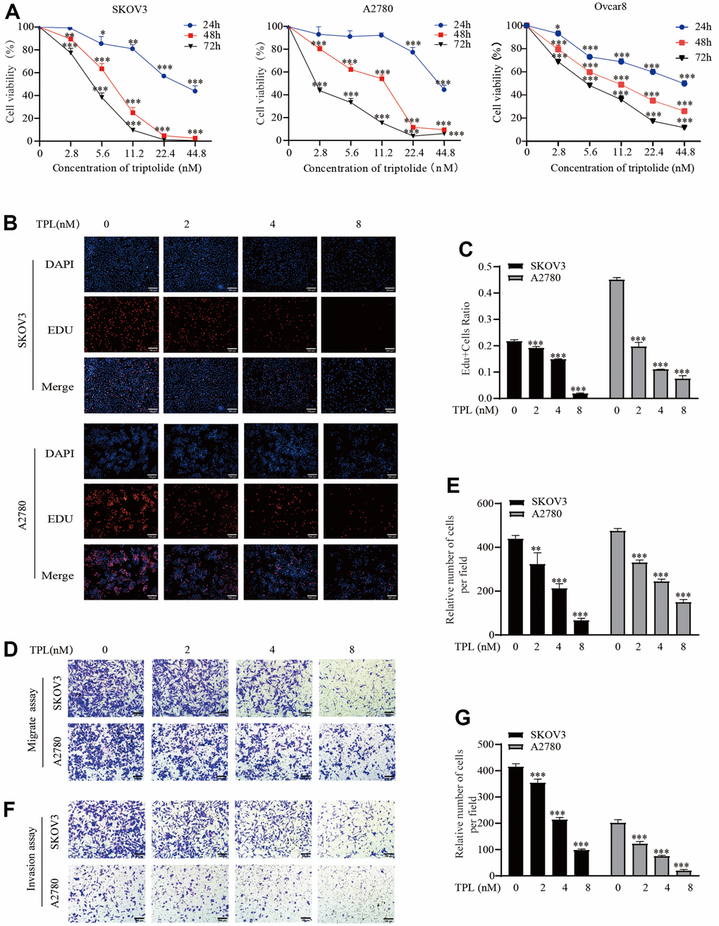 Initially, we performed the CCK8 experiment to examine the impact of TPL on the cytotoxicity of the EOC cells SKOV3, A2780, and Ovcar8. The experiment on cell cytotoxicity showed that the IC50 of TPL on SKOV3 cells was 38.26 ± 5.83, 7.06 ± 1.13, and 3.4 ± 1.11 nM at 24, 48, and 72 h, respectively. For A2780 cells, the IC50 of TPL was 37.59 ± 5.61, 7.83 ± 2.26, and 3.04 ± 1.29 nM at 24, 48, and 72 h. The IC50 of TPL on Ovcar8 cells at 24, 48, and 72 h were 36.92±3.96, 10.93±0.08, and 5.62±0.34 nM (Figure 1A). The sensitivities to TPL between the three EOC cells varied slightly. This result indicated that TPL was cytotoxic against EOC cells in a time-and dose-dependent manner. Then, we chose concentrations 2, 4, and 8 nM of TPL for a follow-up study in EOC cells. The antiproliferative activity of TPL was further evaluated with an EdU incorporation assay. The EDU assay findings also showed that the anti-proliferation ability of TPL was markedly enhanced with increased doses (Figure 1B, 1C).