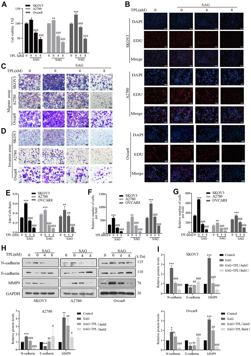 To establish whether TPL could restrict tumor growth by preventing the Hh pathway, we applied SAG to further stimulate this pathway in EOC cells. Both CCK8 and EDU experiments revealed that SAG effectively promoted the proliferation of EOC cells, but TPL treatment dramatically dampened SAG-mediated cell proliferation (Figure 3A, 3B, 3E). Similar phenomena were seen in the Transwell migration and Invasion experiment. SAG remarkably enhanced the capacity of EOC cells A2780, SKOV3, and Ovcar8 to migrate and invade, but TPL effectively suppressed SAG-induced cell migration (Figure 3C, 3F), and invasion ability (Figure 3D, 3G). To further investigate the related markers of invasion, we utilized Western blot analysis to evaluate the protein levels of the epithelial-mesenchymal transition (EMT) markers N-cadherin, E-cadherin, and MMP9, our results showed that SAG upregulated the expression of N-cadherin and MMP9 and downregulated the expression of E-cadherin, but TPL notably reversed these results in a concentration-dependent way (Figure 3H, 3I). These findings implied that the TPL-mediated anti-EOC mechanism should involve the Hh signaling pathway.