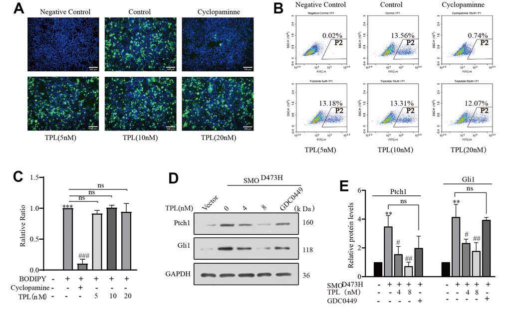 The above results proved that TPL markedly restrained SAG-induced Hh pathway activity. Come to talk theoretically, every core member of the Hh signaling pathway could be used as a target for cancer therapy. At present, the majority of clinically available inhibitors of the Hh pathway directly targeted Smo or its downstream proteins Gli. To investigate whether Smo is the target gene of TPL, we conducted the BODIPY-cyclopamine competition assay and detected HEK293T cells overexpressing Smo by fluorescence microscopy and flow cytometry [39], using the Smo inhibitor Cyclopamine as a positive control. Notably, TPL did not compete with BODIPY-cyclopamine for the Smo receptor, whereas cyclopamine effectively competed with BODIPY-cyclopamine for the Smo receptor (Figure 4A–4C). In addition, a mutation of Smo (SMOD473H) exhibited resistance to GDC-0449 therapy [38]. To further investigate whether the drug resistance caused by SMOD473H mutation could be overcome, we successfully constructed the SMOD473H mutant plasmid and verified it with Smo inhibitor GDC0449 (Supplementary Figure 1). On the contrary, when we transfected mutant SmoD473H into NIH3T3 cells, the protein levels of Ptch1 and Gli1 were notably upregulated, these outcomes serve as reliable indicators of the activation of the Hh pathway, and such activation could be inhibited by TPL in a concentration-dependent pattern (Figure 4D, 4E). Accordingly, we posit that the depressant effect of TPL on the Hh signaling pathway probably not be Smo, of course, it may also be different from the binding site of cyclopamine and Smo. In such circumstances, thus, it is led us to highly suspect that TPL acts directly on Gli or downstream molecules of the signaling pathway in Smo.