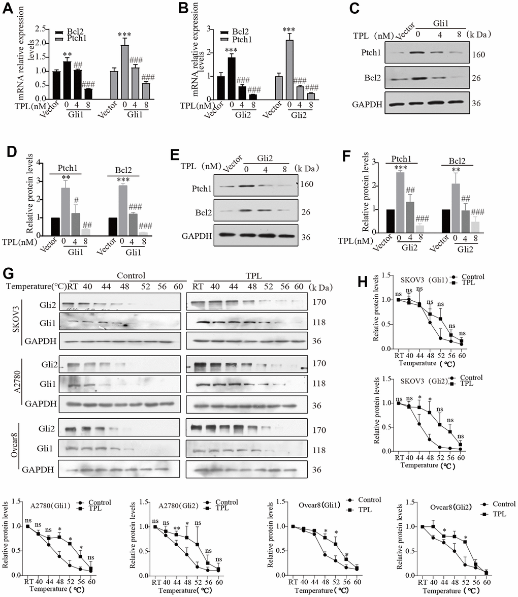The activation of the Hh pathway comprises both classical and non-classical pathways. For both pathways, all biological functions depend on the transcriptional effector Gli at their distal ends. Therefore, targeted inhibition of Gli transcription factors may represent a better choice for restraining the Hh pathway activity. To further investigate whether TPL inhibits the activity of the Hh pathway through targeted inhibition of Gli, we focused on investigating transcription factors Gli1 and Gli2, which primarily function as transcriptional activators to activate the Hh signaling pathways and exhibit high homology. Thus, Gli1 or Gli2 were transfected into the HEK293T cells and treated with or without TPL. The transfection efficiency was verified by Western blot (Supplementary Figure 2). RT-qPCR and Western blot experiments revealed that TPL therapy dramatically reduced the mRNA (Figure 5A, 5B) and protein expression (Figure 5C–5F) of target genes Ptch1 and Bcl2 in a concentration-dependent pattern. To provide further evidence for this observation, we next investigated whether TPL and Gli1 or Gli2 directly interacted to control the activity of the Hh pathway. The interaction between TPL and Gli1 or Gli2 protein was verified with a CETSA assay. Our results established that the EOC cells after TPL treatment had significantly higher thermal stability. Results from the CETSA assay suggested that TPL could directly bind Gli1 and Gli2 proteins (Figure 5G, 5H).