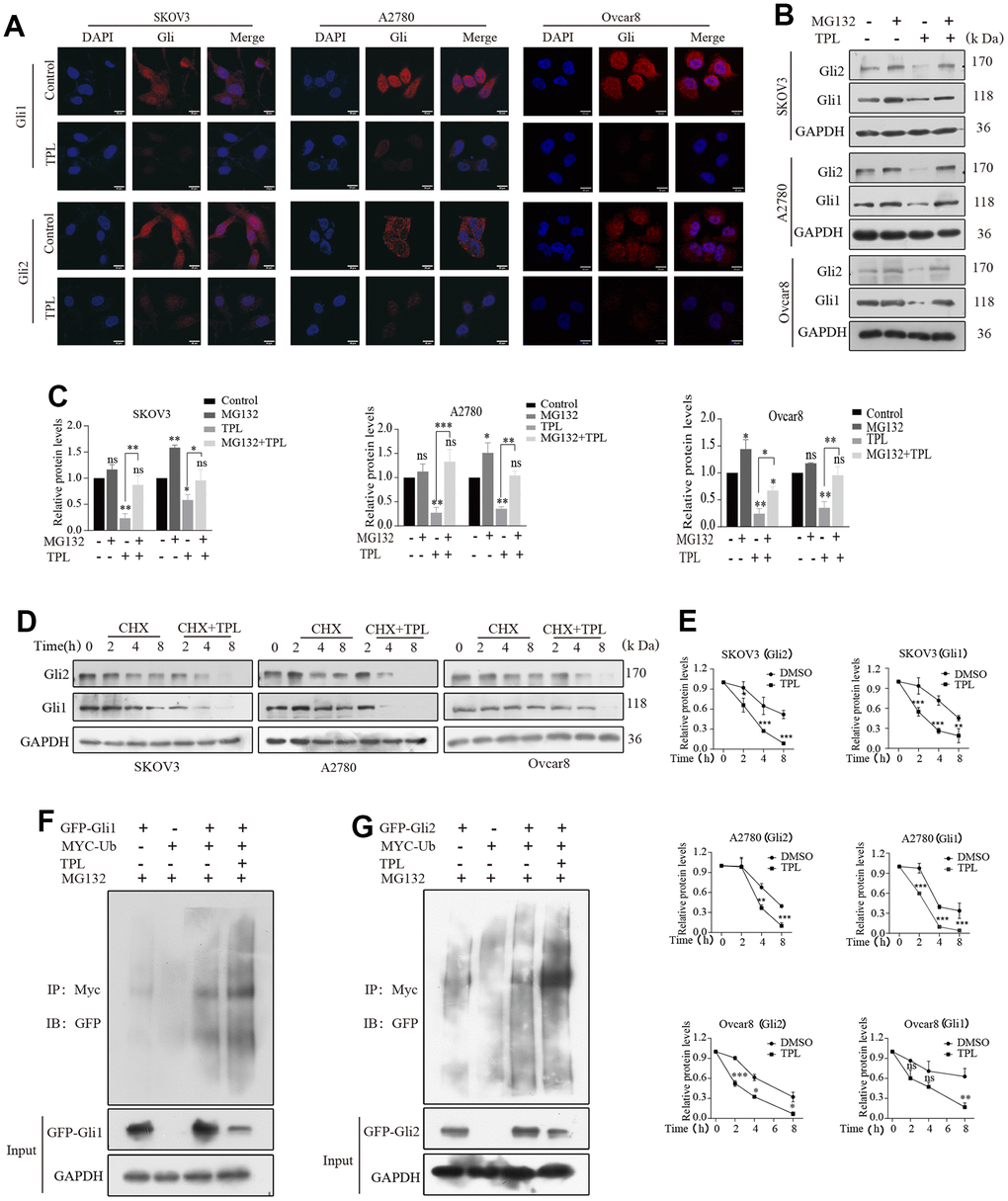 Considering that one of the main mechanisms for controlling Gli activity is proteasomal degradation [40]. we subsequently investigated whether TPL could also affect Gli activity through the proteasome degradation pathway. As displayed in Figures 6B, 6C, the TPL-induced decrease of the Gli1 and Gli2 proteins was recovered by treatment with proteasome inhibitor MG132. Furthermore, we studied the effect of TPL on the stability of Gli1 and Gli2 proteins treated with the protein synthesis inhibitor cycloheximide (CHX). The outcomes proved that TPL treatment dramatically accelerated the degradation of Gli1 and Gli2 proteins in the SKOV3, A2780, and Ovcar8 cells (Figure 6D, 6E). The ubiquitin-proteasome system (UPS), a crucial pathway of protein degradation, participates in the degradation of most proteins. Consequently, we were curious about TPL to assess its effect on the ubiquitination of Gli1 and Gli2. The results showed that TPL treatment dramatically downregulated the Gli1 and Gli2 protein levels and upregulated the ubiquitination levels of Gli1 and Gli2 (Figure 6F, 6G). Altogether, our study demonstrated that the UPS was responsible for the TPL-induced Gli1 and Gli2 protein degradation.