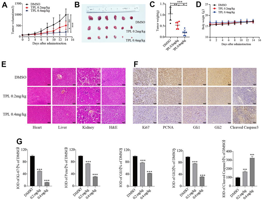 Lastly, we further validated the impact of TPL on EOC in vivo. Three groups of mice (n=6) were given intraperitoneal injections of DMSO, TPL (0.2 mg/kg/d), or TPL (0.4 mg/kg/d). The tumor volume and final weight of treatment with TPL administration groups were remarkably lower in comparison to the DMSO group (Figure 7A–7C). The body weight of the TPL groups was not decreased significantly compared with the DMSO groups (Figure 7D). Major organs like the heart, liver, and kidney did not experience structural abnormalities as a result of TPL treatment, according to toxicity studies using H&E staining (Figure 7E). According to the above findings, TPL has a strong inhibitory effect on tumor growth and exhibits low toxicity in tumor-bearing mice at dosages of 0.2 and 0.4 mg/kg. IHC staining studies revealed that TPL treatment significantly boosted the expression of the apoptotic protein Cleaved Caspase 3, indicating that TPL treatment induced tumor cell apoptosis. In contrast, TPL treatment markedly reduced the expression of the proliferation-associated proteins PCNA and Ki-67 compared with the DMSO group, as expected (Figure 7F, 7G). In addition, we performed IHC staining of the Gli1 and Gli2 to understand whether TPL could restrict Hh pathway activity in vivo. Our research indicated that TPL therapy dramatically reduced Gli1 and Gli2 protein levels (Figure 7F, 7G). As a whole, the above outcomes confirmed that TPL could hinder the proliferation of EOC cells and the activity of the Hh pathway in vivo.