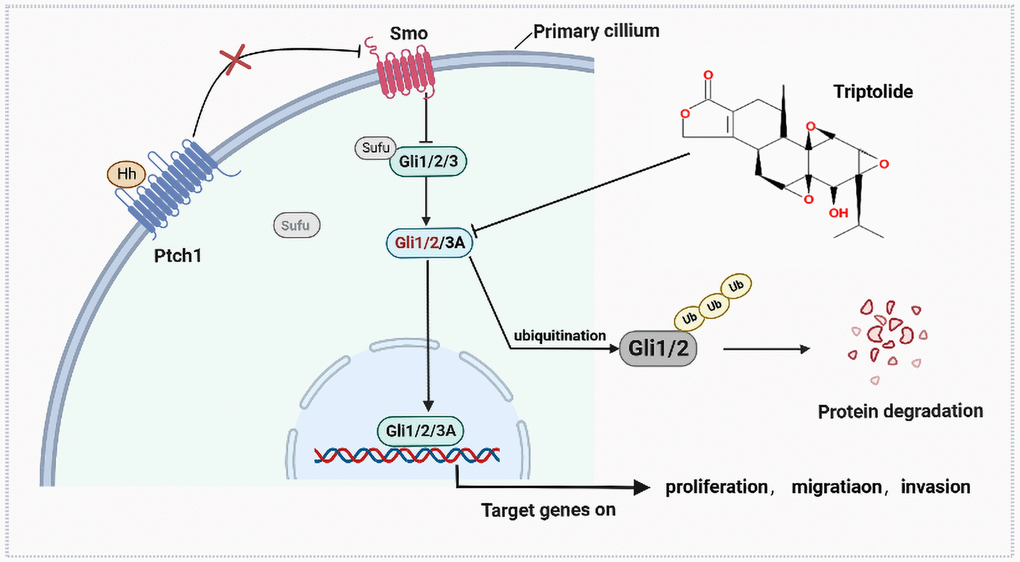 TPL was a purity of 98% purchased from J&K Scientific (USA) (CAS: 38748-32-2), dissolved in dimethyl sulfoxide (DMSO), and stored at -80° C. Gli antagonist GANT61 was purchased from Sigma-Aldrich (USA) (CAS: 500579-04-4), Smoothened antagonist GDC0449 (CAS: 879085-55-9) and Cyclopamine (CAS: 4449-51-8) and Smoothened agonist SAG (CAS: 912545-86-9) were obtained from selleckChem (USA). Antibodies against GAPDH, Gli2, GFP (50430-2-AP), MYC (16286-1-AP), and goat anti-rabbit/mouse IgG were purchased from ProteinTech Group (China), anti-Ptch1 (Zenbio, China), anti-Gli1 (Bioss, China), anti-Bcl2 (Abclonal, a19693, USA), anti-Cleaved Caspase 3 (Cell Signaling Technology #9664, USA), and the other antibodies including Smo (ab72130), E-cadherin (ab1416), N-cadherin (ab18203), MMP9 (ab76003), PCNA (ab92552) and Ki-67 (ab16667) were obtained from Abcam (UK).