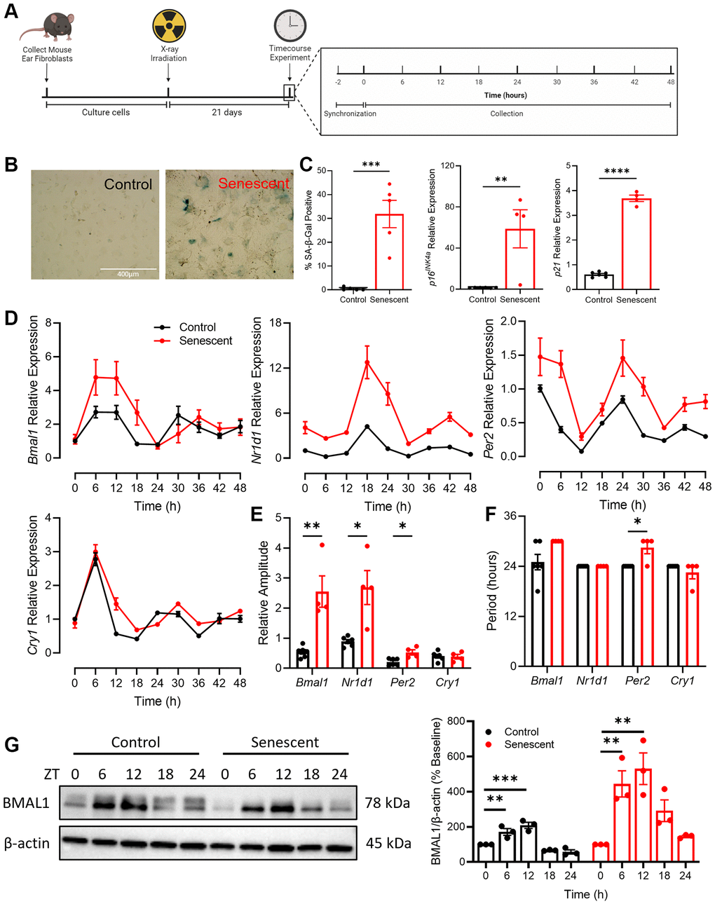 To establish a model of senescence, mouse adult fibroblasts (MAFs) were isolated from the ears of C57BL/6 mice and were sham irradiated (control) or x-ray irradiated to induce senescence (Figure 1A). There was a significant increase in key markers of senescence, including altered cellular and nuclear morphology, senescence-associated β-galactosidase (SA-β-Gal) staining, and expression of CDKIs p16INK4a and p21 in irradiated cells compared to the control cells (Figure 1B, 1C). To investigate the impact of senescence on circadian rhythmicity, we examined core circadian clock components in senescent and non-senescent contexts. Control and senescent cells were treated with 100 nM dexamethasone to synchronize their circadian clocks [32] and then collected every 6 hours for 48 hours (Figure 1A). Expression of core circadian clock genes Bmal1, Nr1d1, Per2, and Cry1 were assessed by qPCR (Figure 1D) and the R package MetaCycle [33] was used to determine the rhythmicity of the time course data (Figure 1E, 1F). Compared to control cells, senescent cells had increased expression of Bmal1, Nr1d1, and Per2 across the time course, with the most pronounced increases apparent at the peaks of each respective gene (Figure 1D). The amplitude, which is the height of peaks relative to baseline, of Bmal1, Nr1d1, and Per2 expression was significantly increased in the context of senescence (Figure 1E). The period, which is the time elapsed during one complete circadian cycle, was increased by ~6 hours in Bmal1, and by ~4 hours in Per2 expression (Figure 1F).