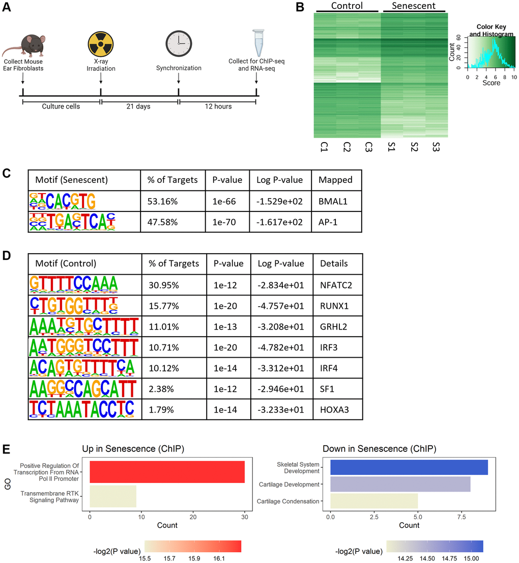 To study the global role of BMAL1 transcriptional activity in senescence, we synchronized control and senescent cells and collected them for BMAL1 chromatin immunoprecipitation with sequencing (BMAL1-ChIP-seq) 12 hours later (Figure 2A). This time was chosen to align with the highest abundance of BMAL1 protein (Figure 1G). BMAL1-ChIP-seq identified 605 differentially bound regions (logFC>|2|, P < 0.05) between control and senescent cells (Figure 2B). Motif analysis identified the two most abundant motifs enriched in senescent cells as the canonical E-box motif CACGTG, which is a known BMAL1 binding site [34] and, unexpectedly, the TGASTCA motif, which is a binding site of the AP-1 transcription factor [35] (Figure 2C). In contrast, there was only slight enrichment of several growth and proliferation associated motifs in control cells relative to senescent cells (Figure 2D). This suggests that while BMAL1 is bound to many genomic regions in healthy cells, this is lost in favor of more narrow binding in senescence with BMAL1 highly enriched at the E-box and AP-1 motifs. Consistent with this observation, gene ontology analysis of target genes identified by BMAL1-ChIP-seq in senescent cells showed an increase in BMAL1 binding to genes that plausibly influence the senescence program, including genes engaged in cell cycle arrest (Kdm6b, Smad3, Nr5a2) and MAPK signaling (Gdnf, Lif, Sall1), as well as a decrease in BMAL1 binding to genes associated with BMP pathway proliferative genes (Runx2, Bmpr1b, Col2a1, Col9a1, Col11a1). (Figure 2E).
