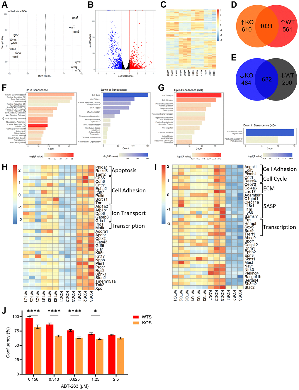 Finally, given that senescent cells are resistant to apoptosis, we wanted to evaluate the significance of the BMAL1-dependent transcriptional changes, especially the changes in anti-apoptotic, pro-survival genes. We evaluated the dose response of WT and BMAL1 KO senescent cells to the senescent cell killing (“senolytic”) drug ABT-263 (navitoclax) which inhibits Bcl-2 family members and kills senescent fibroblasts in culture. We plated 5,000 senescent cells per replicate well and used a live cell monitoring system to measure confluence as a readout of senolytic activity. A greater reduction in confluence, indicative of greater senolytic activity, was evident in the KO senescent cells compared to WT senescent cells, at all except the highest dose (Figure 4J). This indicates that BMAL1 mediates the presence of pro-survival Bcl-2 family members and confers resistance to apoptosis in senescence, and the subsequent loss of BMAL1 sensitizes cells to ABT-263-induced cell death.