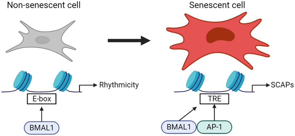 Here, we propose a previously unappreciated role of the core circadian clock component BMAL1 in AP-1 transcriptional control of the senescence program. In this study we show that the normal behavior of BMAL1 in driving transcription in non-senescent cells is lost in favor of narrow binding to AP-1 binding sites in senescence, and in a senescent context BMAL1 mediates expression of AP-1 target genes conferring resistance to apoptosis. (Figure 5).