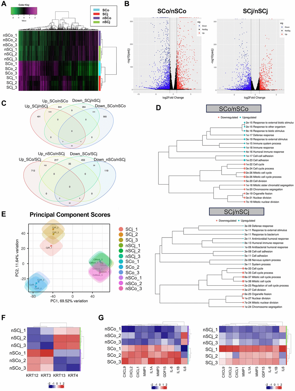 We then conducted gene ontology analysis and identified several biological processes that were significantly enriched in the DEGs. Pathway analysis showed that the upregulated genes were enriched in pathways related to cellular metabolism, cell signaling, and immune response, while the downregulated genes were enriched in pathways related to DNA repair, cell cycle regulation, and chromatin organization, in both SCo and SCj (Figure 2D). Principal component analysis (PCA) was also performed to identify patterns of gene expression variability across samples (Figure 2E). nSCo showed high expression of corneal epithelium-specific keratins, keratin 3 and keratin 12, whereas nSCj exhibited high expression of conjunctival epithelium-specific keratins, keratin 4 and keratin 13 (Figure 2F). There were therefore cell-specific differences in the expression of these keratins. Moreover, SCo and SCj displayed significantly different gene expression profiles compared to nSCo and nSCj (Figure 2E). Both, SCo and SCj showed high expression of inflammatory cytokines, chemokines and matrix metalloproteinases (Figure 2G), suggesting that senescent ocular surface cells acquire a senescence-associated secretory phenotype (SASP).