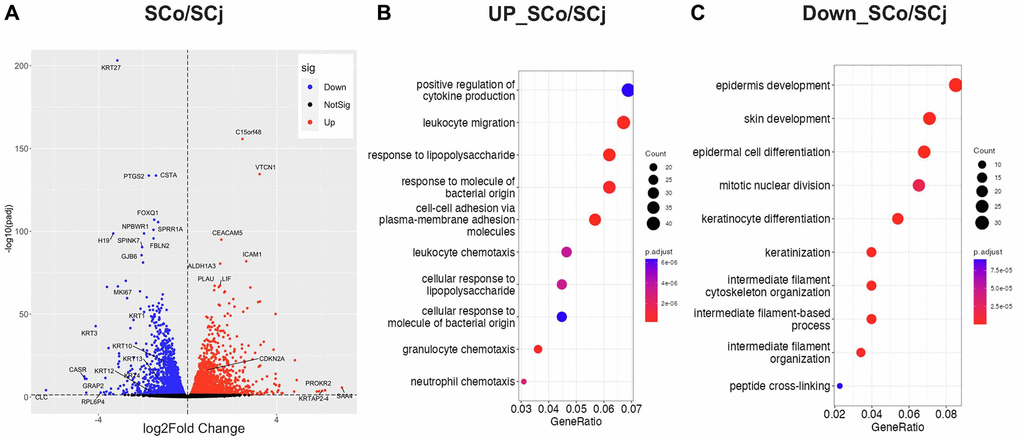 In order to further investigate the differences in their biological functions, we compared the transcriptomic profiles of both senescent cell populations, corneal epithelial cells and conjunctival epithelial cells. Our results showed that these two types of senescent cells have distinct gene expression patterns (Figure 3A). Indeed, to further decipher the biological processes that were affected by cellular senescence in these two cell types, we performed pathway analysis. Interestingly, we found that the inflammatory pathway was more enriched in SCo (Figure 3B), while epidermis development, keratinocyte differentiation, and keratinization pathways were more enriched in SCj (Figure 3C). Interestingly, TGF-β signaling appears to play a more significant role in the senescent phenotype of the corneal cell type compared to the conjunctival cell type (Supplementary Figure 1). These findings suggest that cellular senescence differentially affect the physiological functions of corneal and conjunctival epithelial cells, which could have important implications for the pathology of ocular surface diseases.